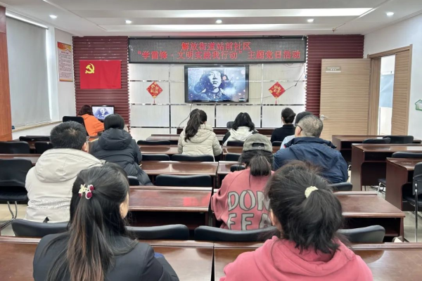 站前社区党员志愿者在齐唱国歌、重温入党誓词后,观看视频《永远的雷锋精神》,集中学习雷锋精神,深化雷锋精神内核。