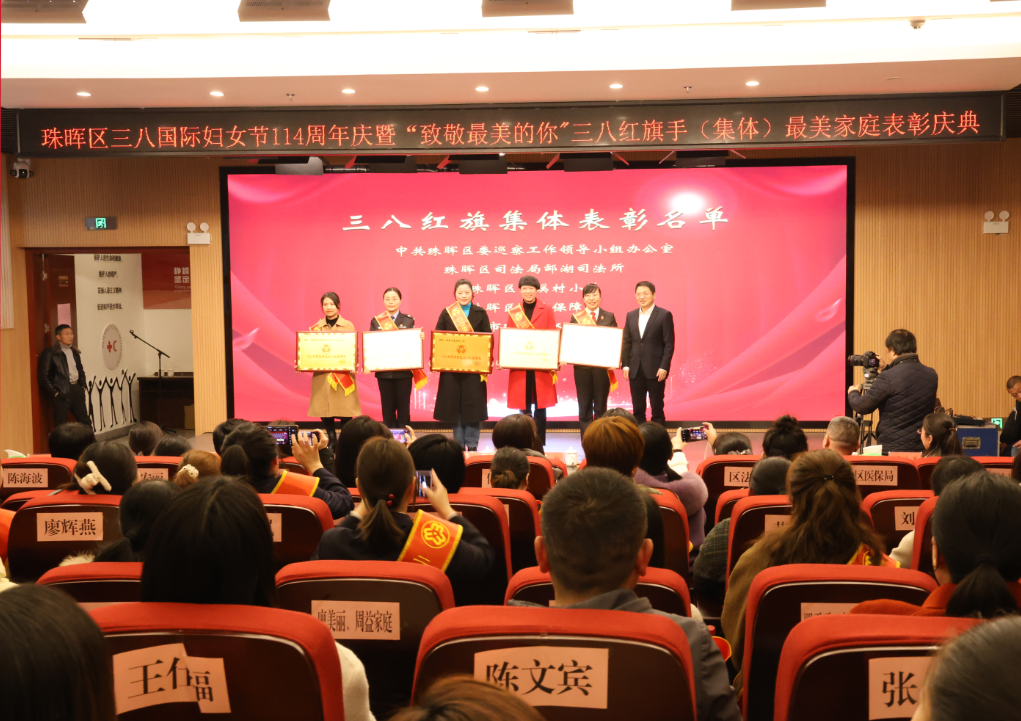 在第114个“三八”国际妇女节即将到来之际,3月7日下午,珠晖区举行三八国际妇女节114周年庆暨“致敬最美的你”三八红旗手(集体)最美家庭表彰庆典,区委副书记、区长张伟出席并为2023年度珠晖区三八红旗集体颁奖,市妇联党组成员、副主席高敏致辞。活动中,区领导肖高德、王武军、陈燕为2023年珠晖区三八红旗手获奖者、珠晖区“最美家庭”获奖代表颁奖,区领导谢志军、赵丹利、区妇联负责人宣读获奖名单,区人民法院、区司法局、区医保局分别带来了精彩纷呈的表演节目,部分获奖代表上台分享工作故事,激发女性力量。