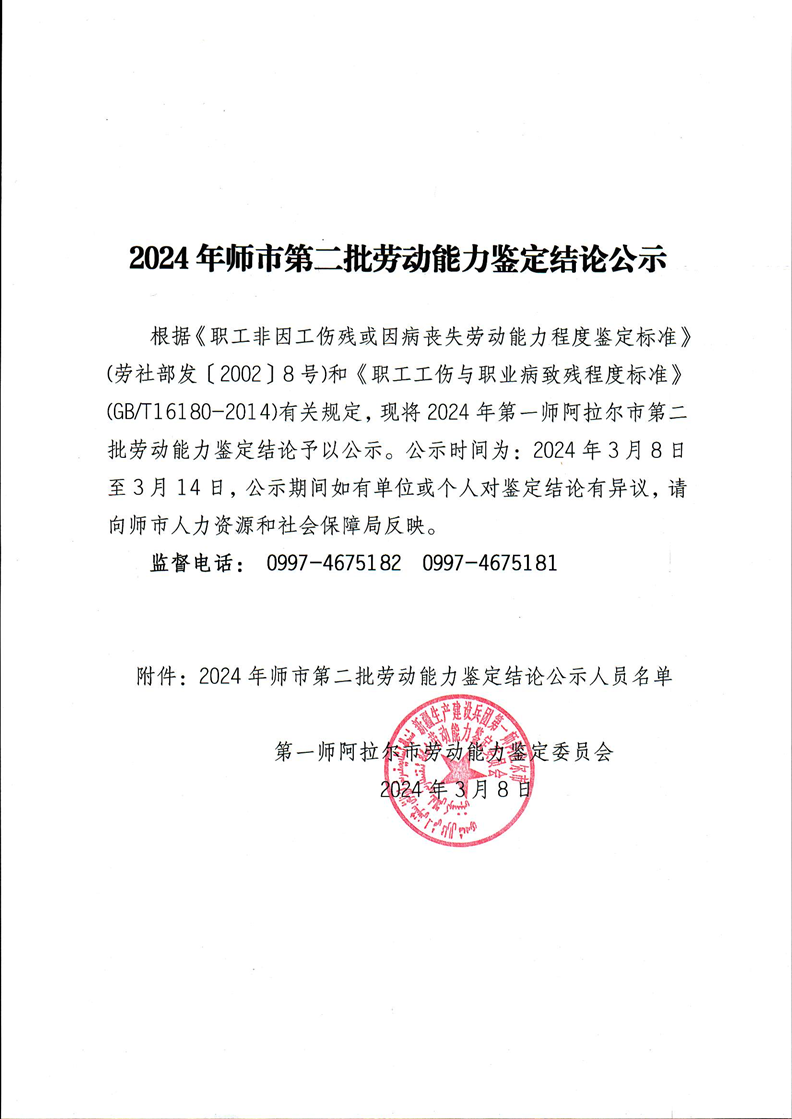 2024年师市第二批劳动能力鉴定结论公示