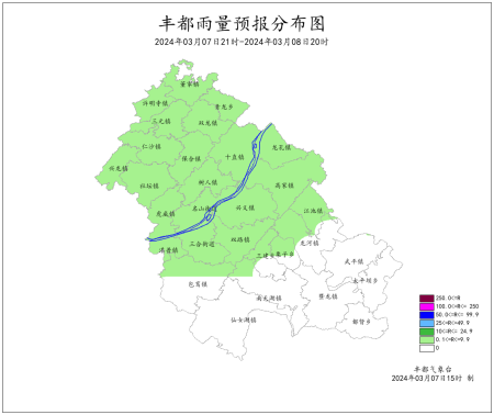 2024年3月6日16时至3月7日16时我县阴天有间断小雨。最大降雨量为3.7毫米(双路)。最低气温0.1~11.3℃,最高气温3.2~14.2℃。丰都国家基本站雨量0.2mm,最低气温9.6℃,最高气温11.1℃。