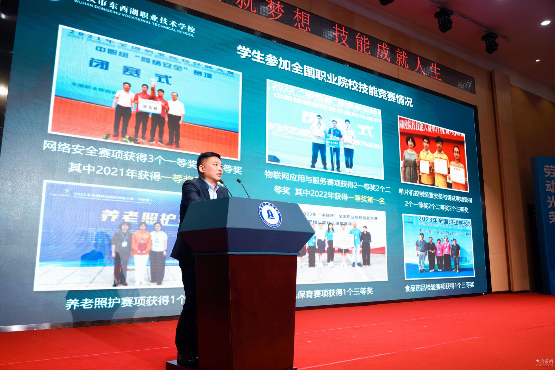 “2023年全国职业院校技能大赛突出贡献奖”是对该校多年来辛勤付出的肯定,是对东西湖职校在职业教育领域所取得卓越成绩的认可。张承胜走上颁奖台,代表学校接受这一殊荣。