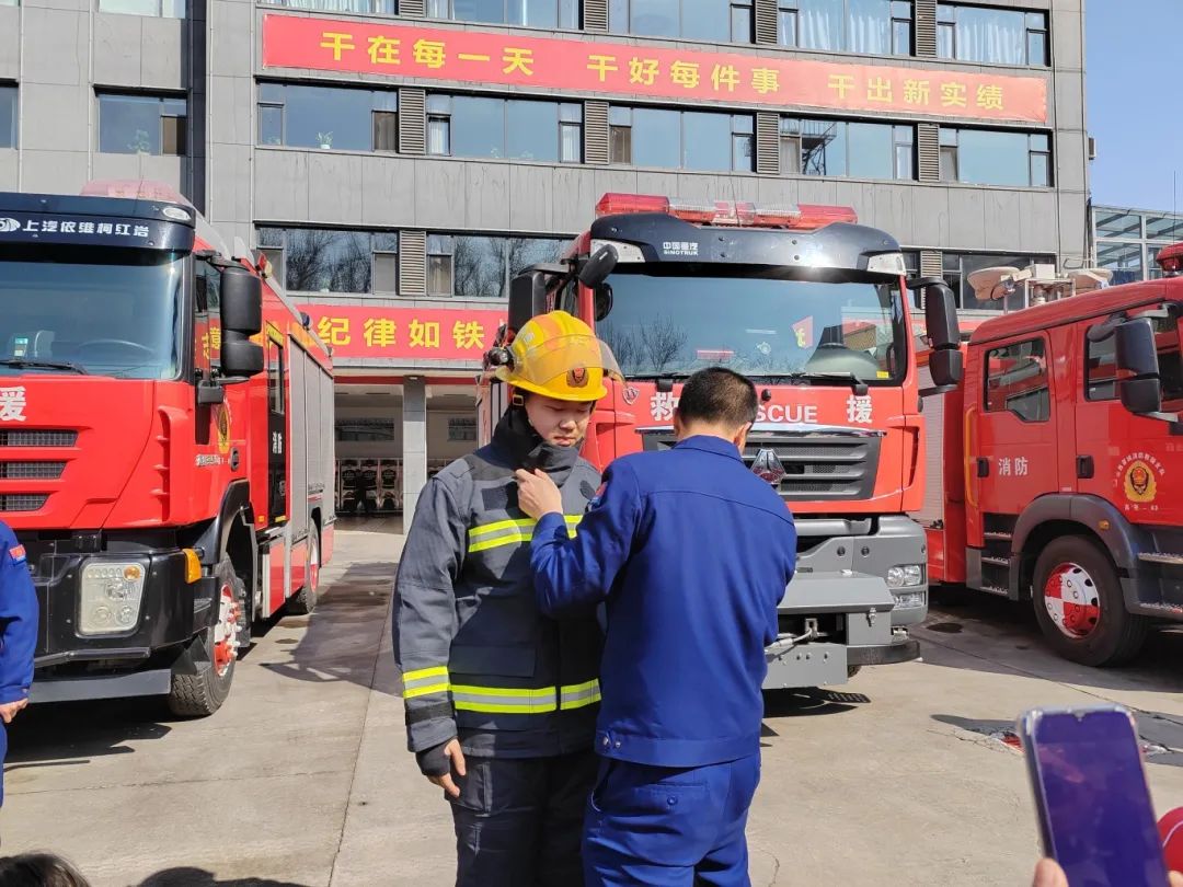 活动中,在消防员的带领下,学生们参观了消防员宿舍、消防车辆,并亲自穿戴上消防服,学习使用消防器材。消防员展示的高空绳索、快速攀爬等高空救援技能,让学生们近距离了解到了消防工作的艰辛,并对消防队员这一份职业有了更深的理解,深刻认识到了消防安全的重要性。