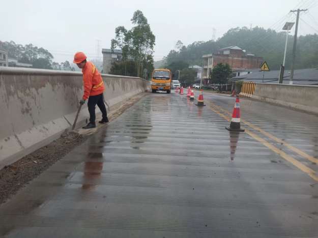 防城公路养护中心工作人员清扫省道312线协境桥桥面。(农腾军 摄)