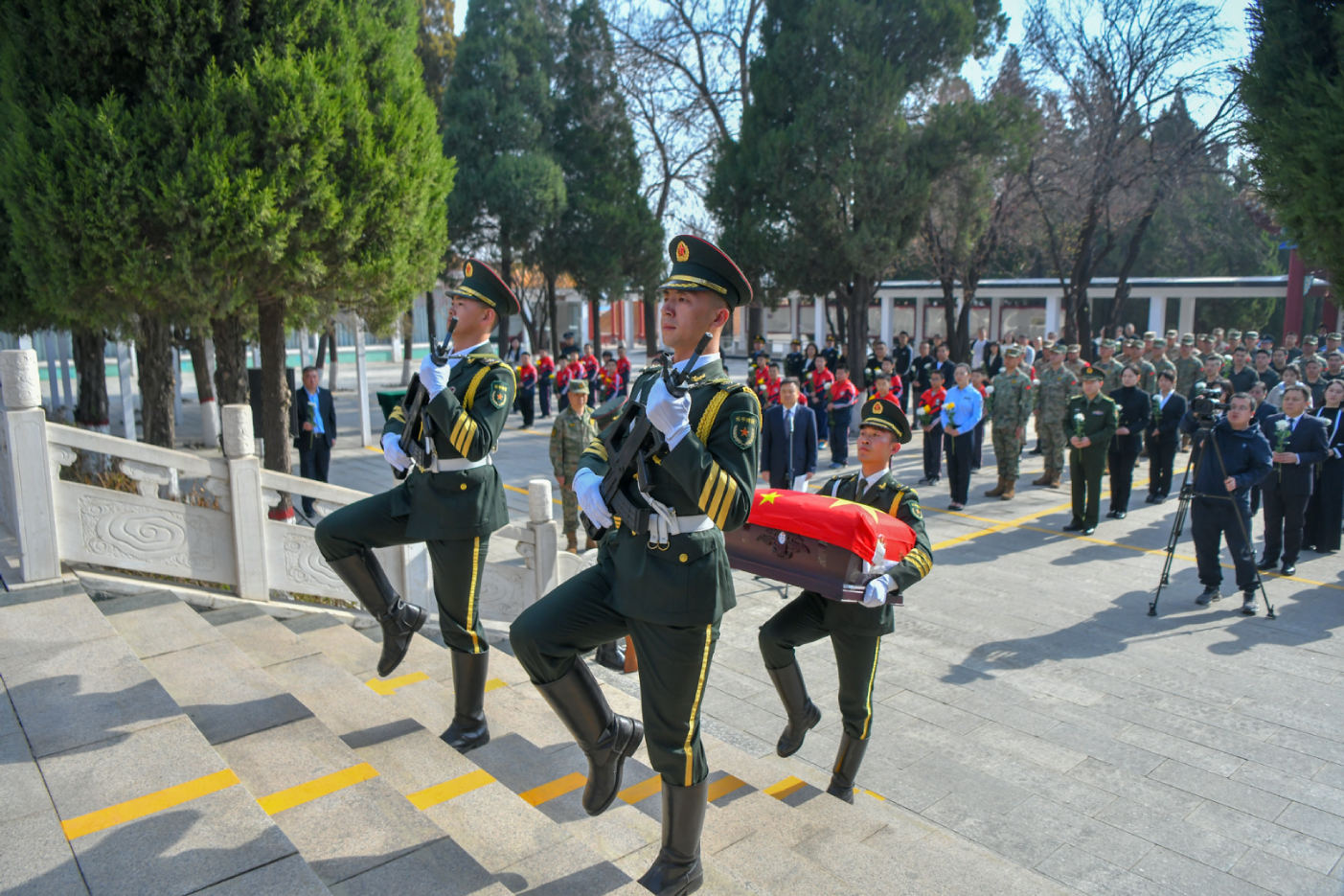 苍松肃立,翠柏静哀。上午9时许,安葬仪式正式开始。伴随着深沉低回的《思念曲》,礼兵礼步缓步向前,将覆盖着中华人民共和国国旗的烈士棺椁,庄重地放置在灵台上。全体人员庄严肃立,奏唱中华人民共和国国歌。