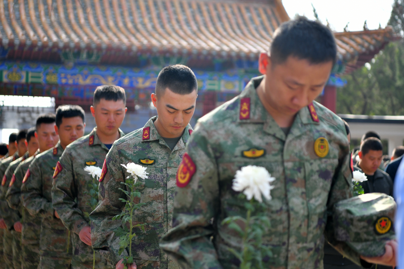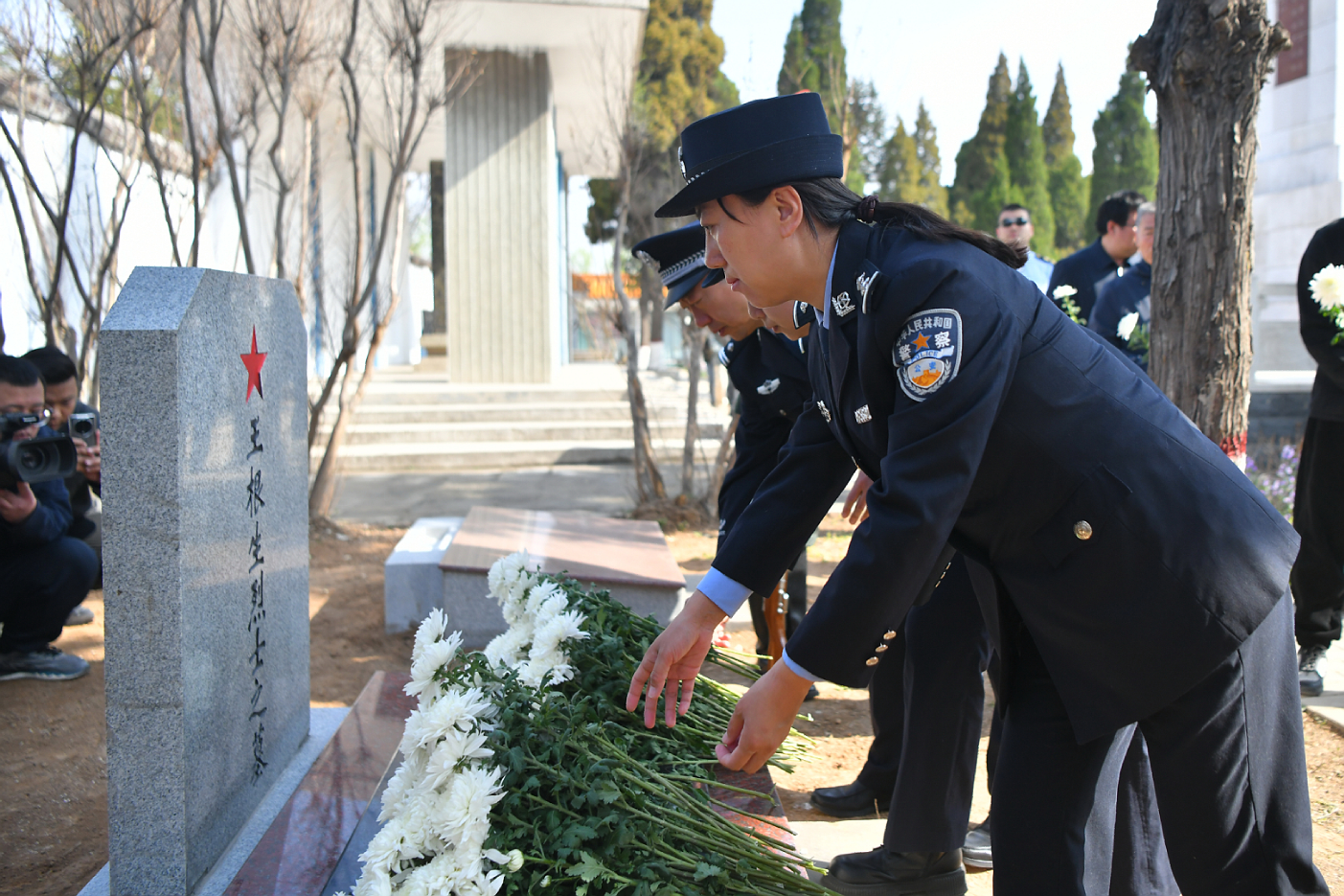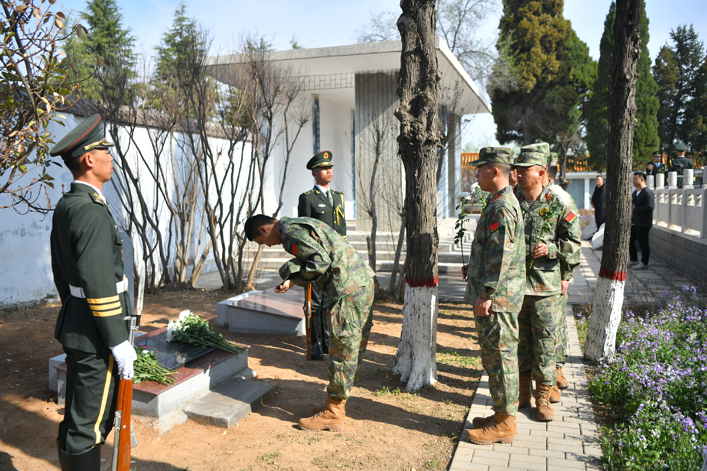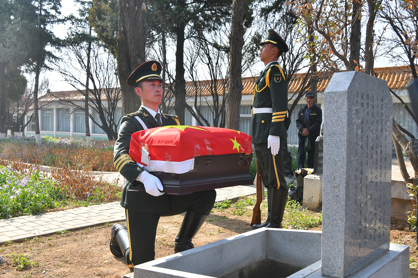 陈亚东宣读了王根生烈士生平,全体人员向烈士默哀,致以崇高的敬意。随后,礼兵护送着覆盖国旗的烈士遗骸棺椁至烈士墓区安葬,参加仪式的全体人员依序向烈士敬献鲜花,缅怀先烈,寄托哀思。