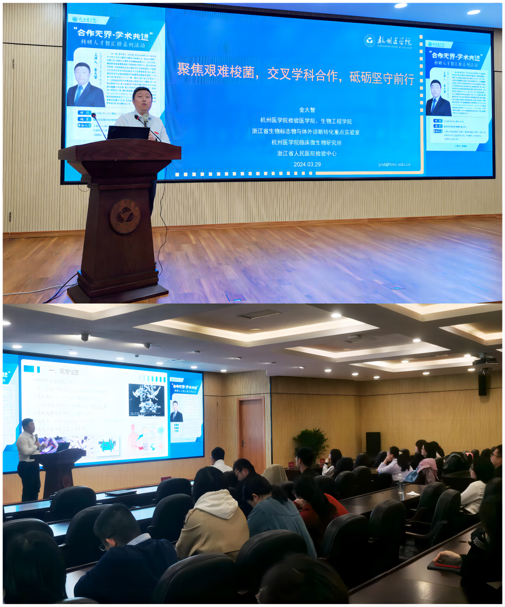 在校党委积极推进“大人才”格局构建,建强“潜心育人的教育教学队伍,求真创新的科研人才队伍,担当作为的管理干部队伍”等“三支队伍”的大背景下,3月29日下午,由人事处、科研处组织的首期“合作无界?学术共进”科研人才汇智桥系列活动如期在临安校区举行。首期科研人才汇智桥的主讲人是浙江省生物标志物与体外诊断转化重点实验室主任、浙江省科技进步二等奖获得者、检验医学院、生物工程学院金大智研究员。各学院青年科研人才、研究生代表,人事处、科研处以及部分学院领导参加了本次活动。