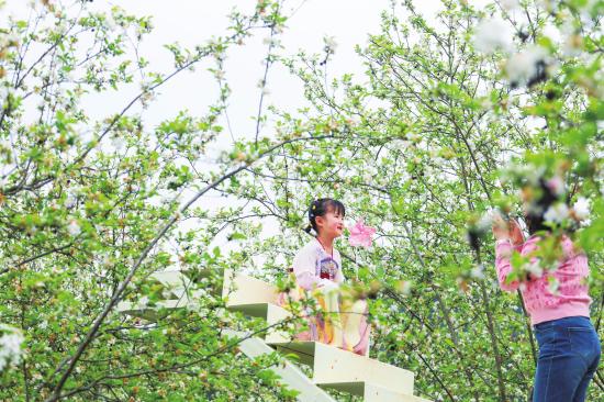 3月30日,大足区棠香街道惜字阁村海棠园,各种海棠花陆续绽放,吸引了众多游客拍照打卡。
