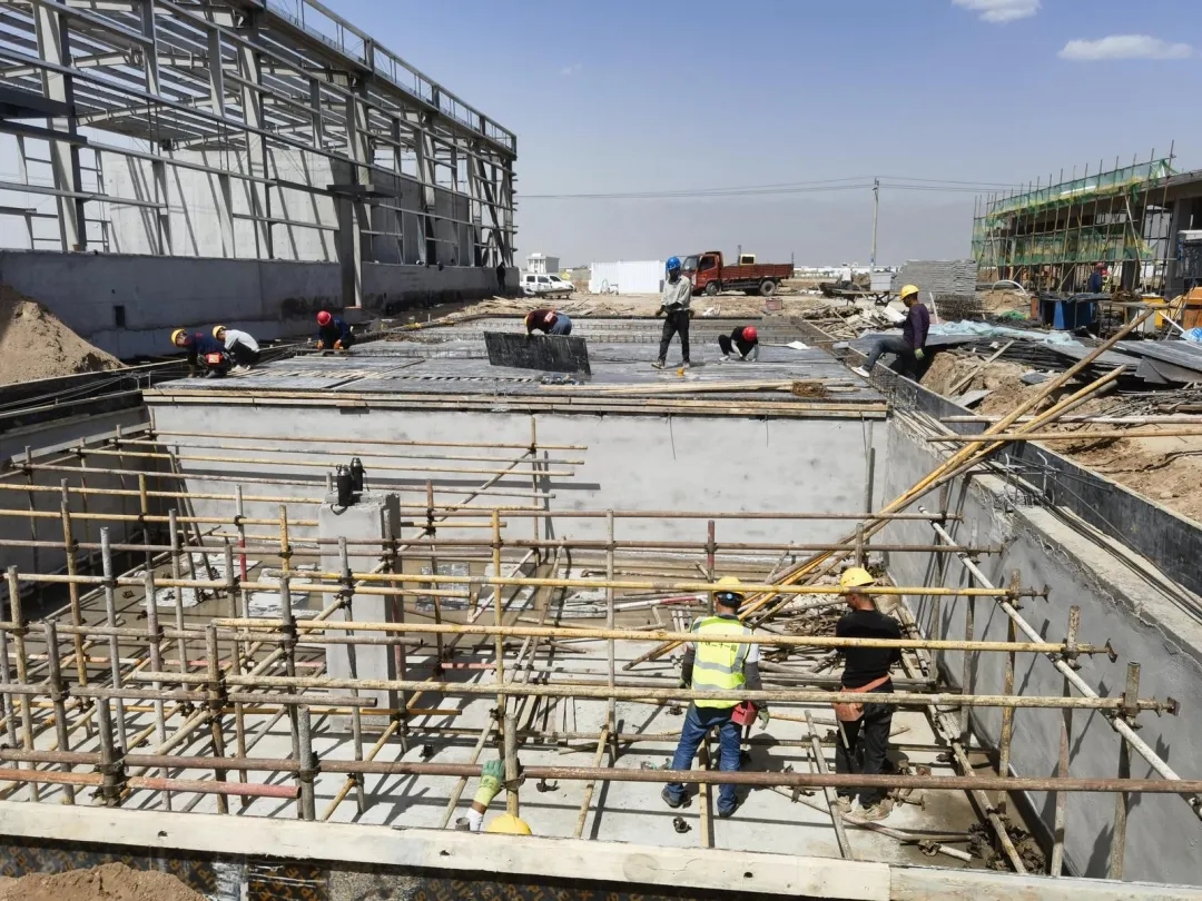 当日11时许,记者在施工现场看到,该项目的生产车间钢架结构已经搭好,消防水池也已经建好,车间基础钢构及顶构都安装完成。另一边,办公及辅助生产区也已具雏形。