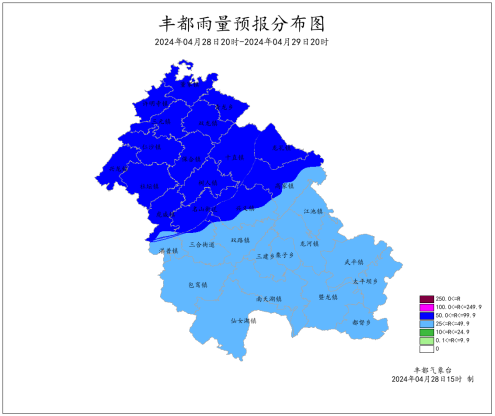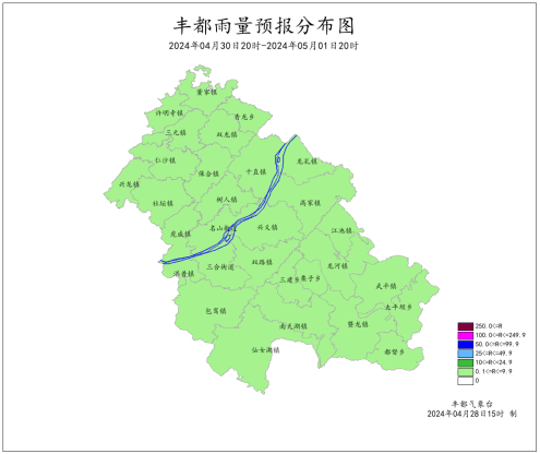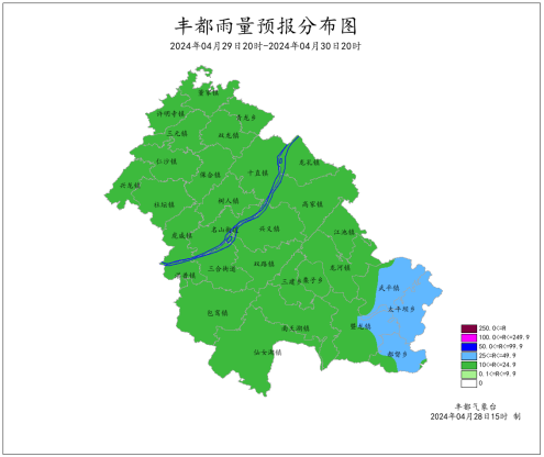 2024年4月27日16时至4月28日16时我县多云。最低气温5.7~18.7℃,最高气温18.7~32.9℃。丰都国家基本站最低气温17.5℃,最高气温27.2℃。