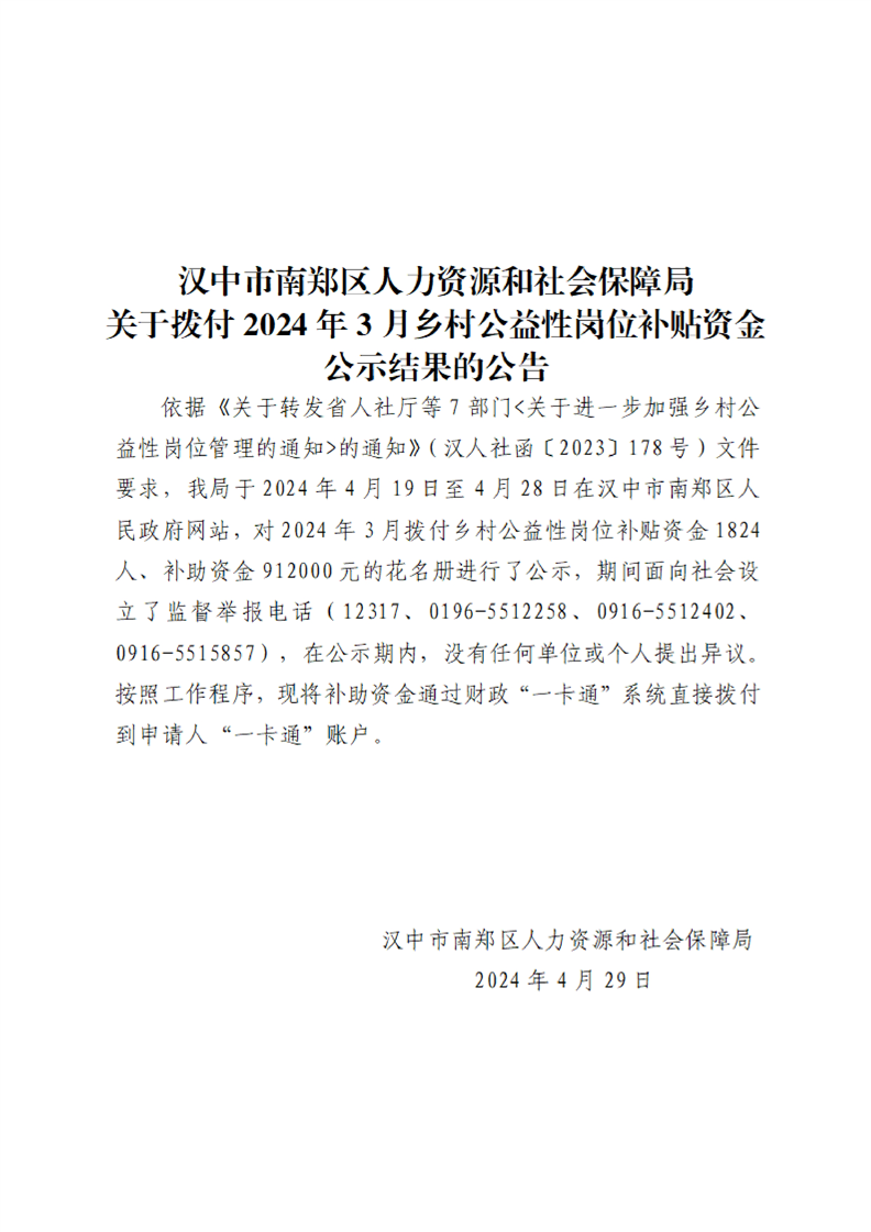 汉中市南郑区人力资源和社会保障局关于拨付2024年3月乡村公益性岗位补贴资金公示结果的公告