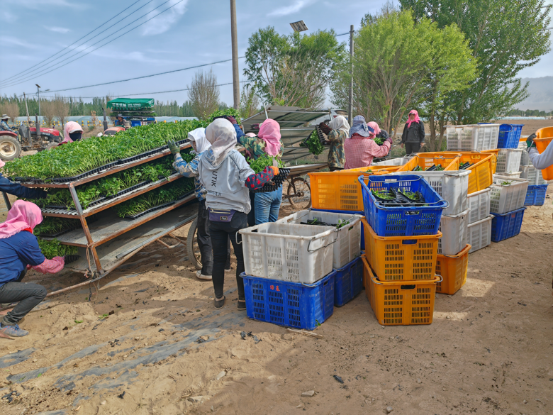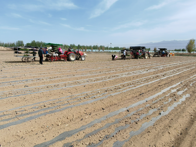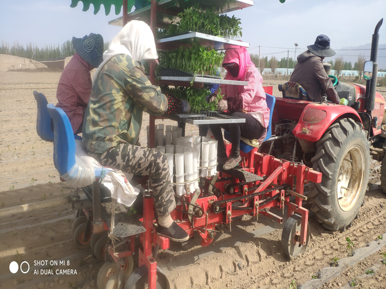 4月25日,在高台县秀娟农业发展专业合作社辣椒种植基地,3台新型辣椒移栽机穿梭田间,工作人员正有条不紊地进行辣椒取苗、投苗、栽植、覆土、压实等移栽作业,移栽机工作人员将椒苗投放在移栽机转盘筒内,随着机器的运行,幼苗会自动嵌入土壤中,放眼望去,田地里移栽好的辣椒苗整齐排列,让春日的大地充满生机。
