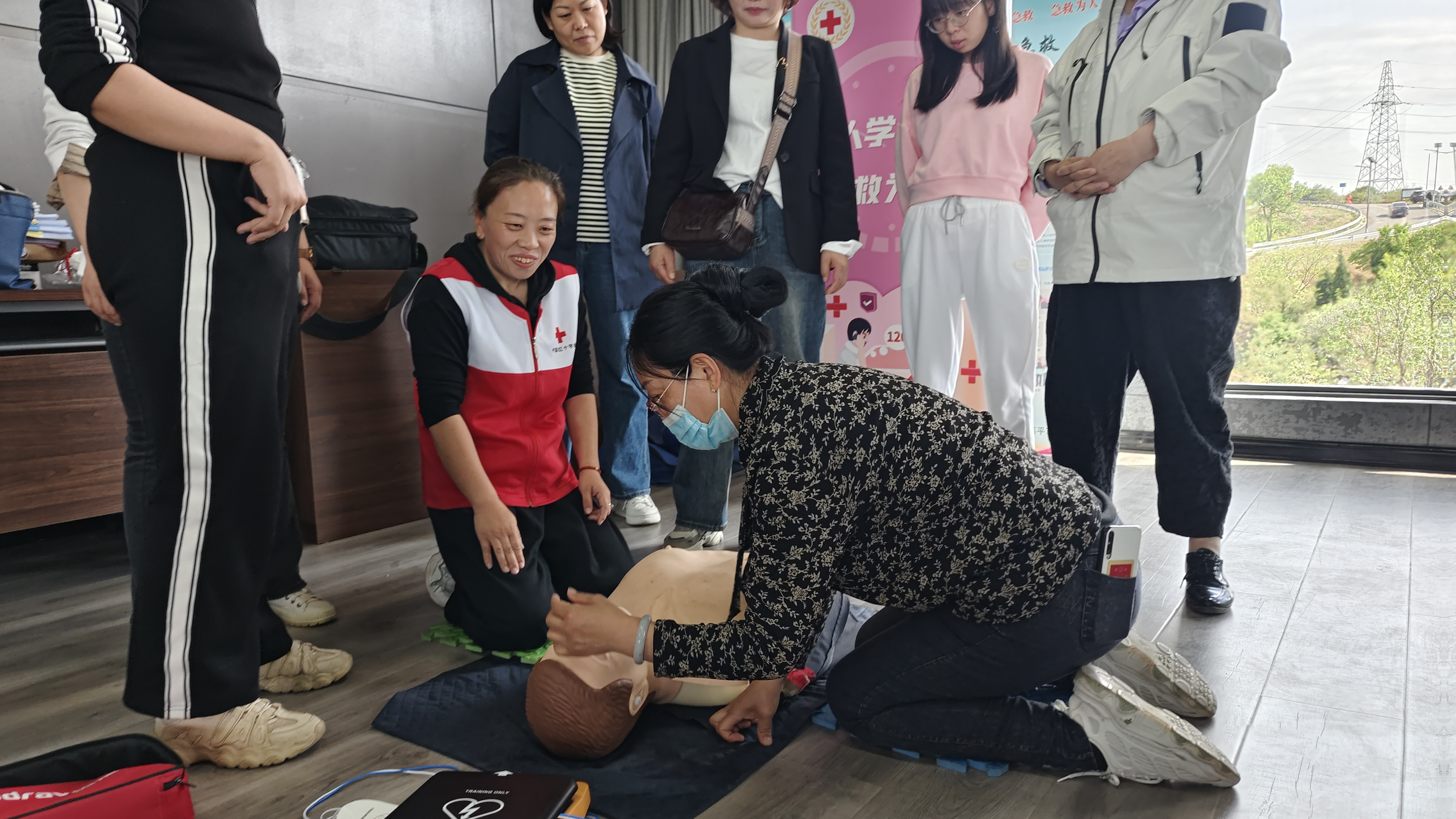 活动现场,市红十字会的专业救护老师详细讲解了心肺复苏、AED使用等急救技能的操作流程与注意事项,并进行分组示教。培训着重对心脏胸外按压、人工呼吸以及AED使用等进行现场实操。救护员借助模拟人,揣摩动作要领,反复练习。