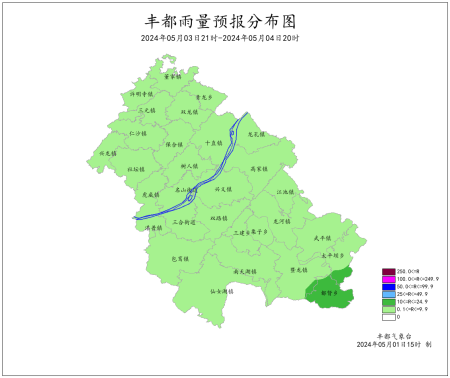 2024年4月30日16时至5月1日16时我县小雨、局地中雨。最大降雨量为11.8毫米(南天湖景区)。最低气温6.5-16.3℃,最高气温8.2~18.7℃。丰都国家基本站雨量2.1mm,最低气温14.3℃,最高气温16.5℃。