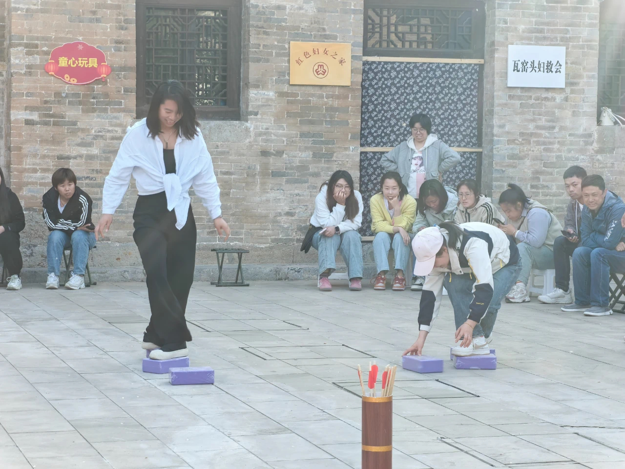 在瓦窑头红色文化体验区,全体人员团结协作,掀起了团队小游戏热潮。争分夺秒“摸石过河”、全是技巧“投箭入壶”、团队合作“乒乓接力”、灵活敏捷“袋鼠跳跳跳”,还有考验参与者平衡感与专注力的“原地踏步走”,游戏比赛中,大家携手、呐喊、奔跑、对抗,进一步激发了青年们的热情与活力,聚青春力量、展“五四”风采。
