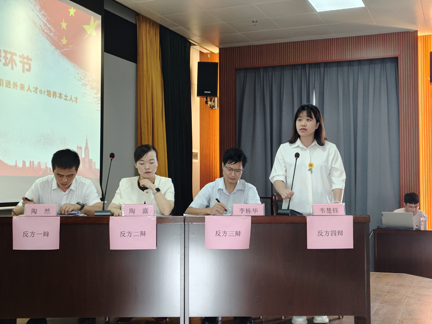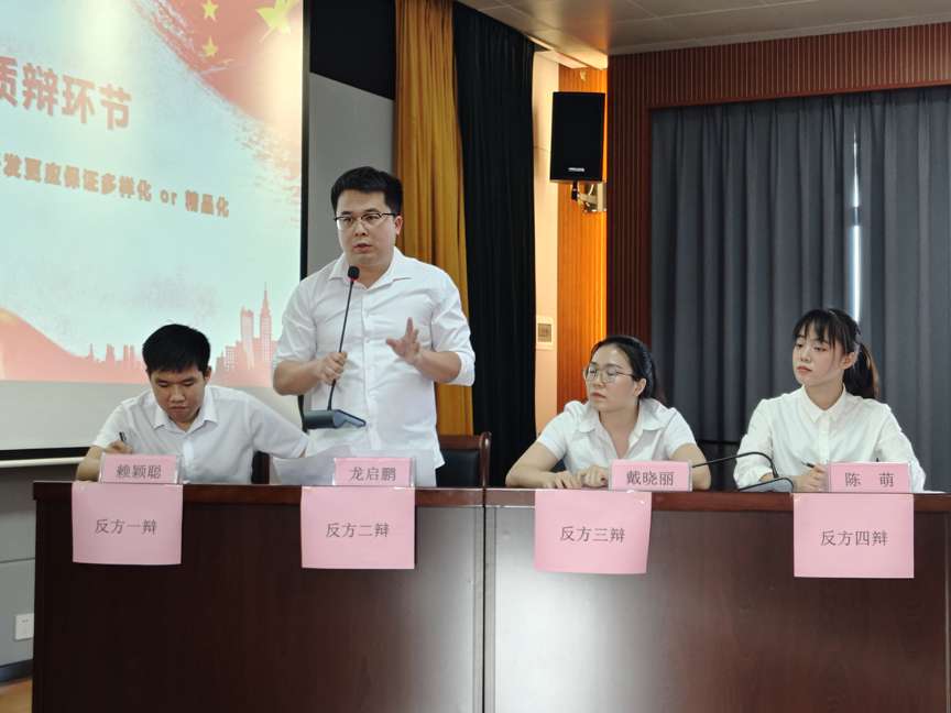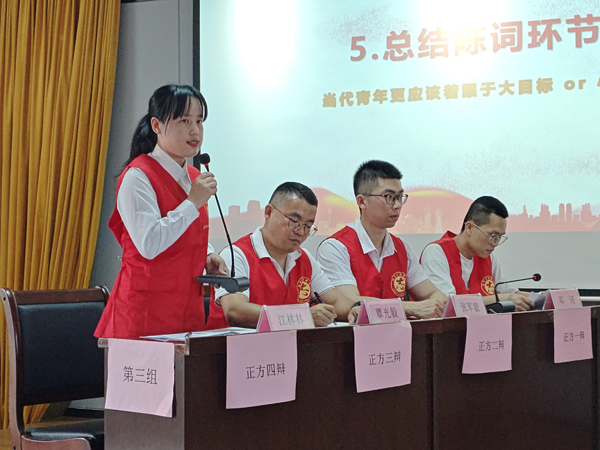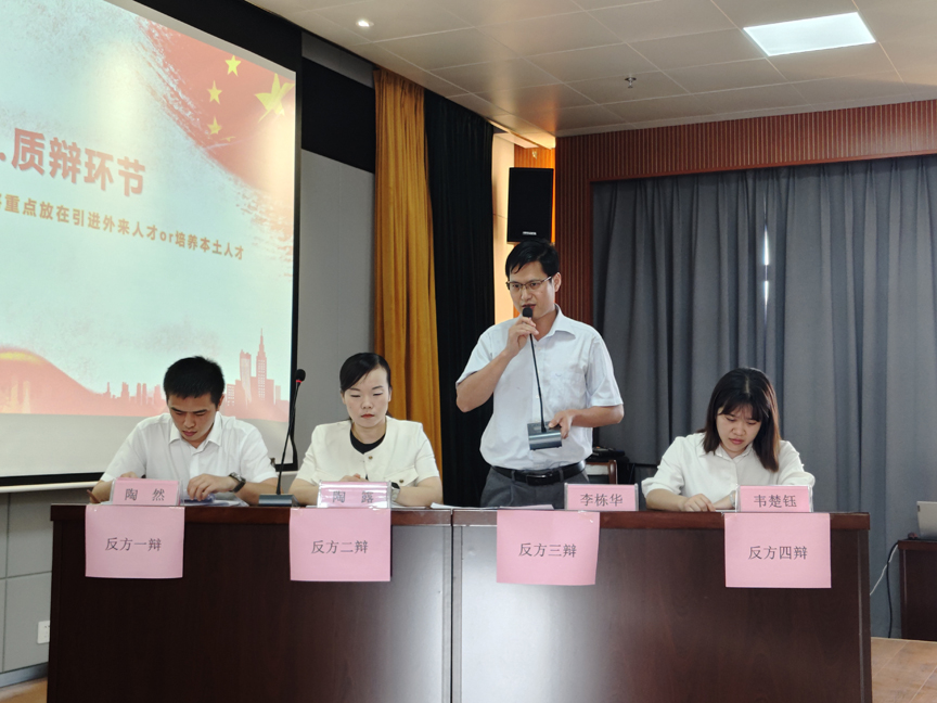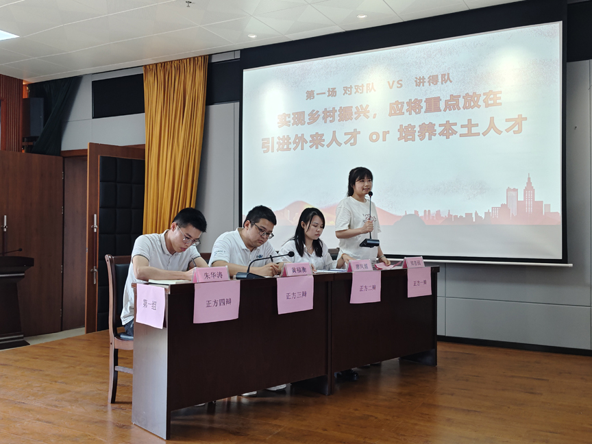 论题立足中渡实际,结合新时代新青年的使命担当,助推进中渡经济高质量发展。三场比赛分别围绕“实现乡村振兴,应将重点放在引进外来人才上还是放在培养本土人才”、“当代青年更应该着眼于大目标还是小日子”和“红色旅游文化产品的开发更应保证多样化还是精品化”三个论题展开,按照开篇立论、驳立论、质辩、自由论辩、总结陈词5个环节进行辩论。