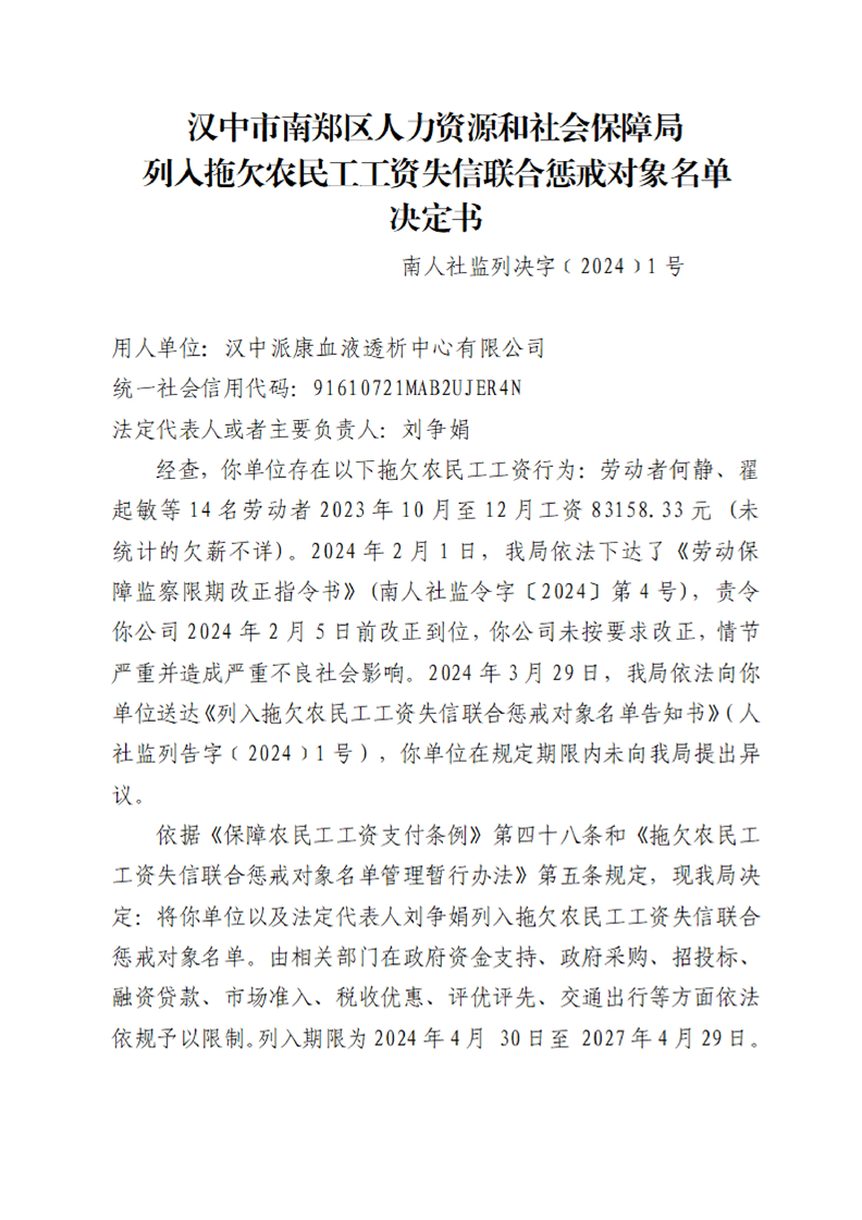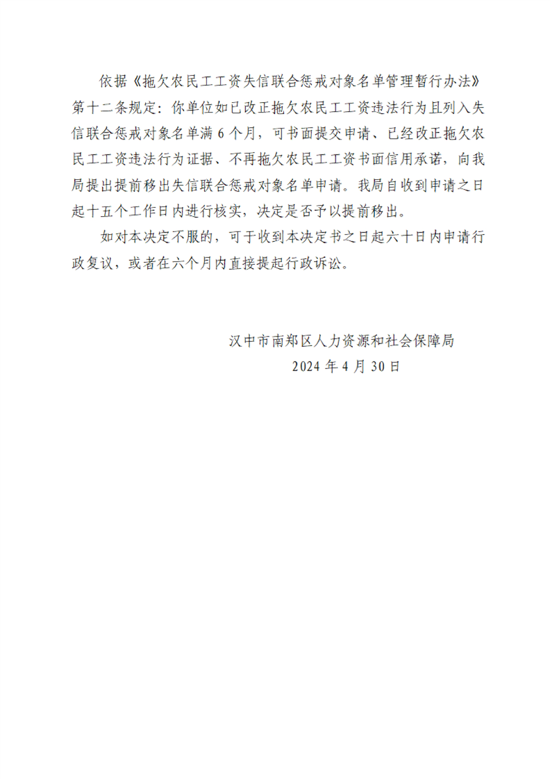 汉中市南郑区人力资源和社会保障局列入拖欠农民工工资失信联合惩戒对象名单决定书