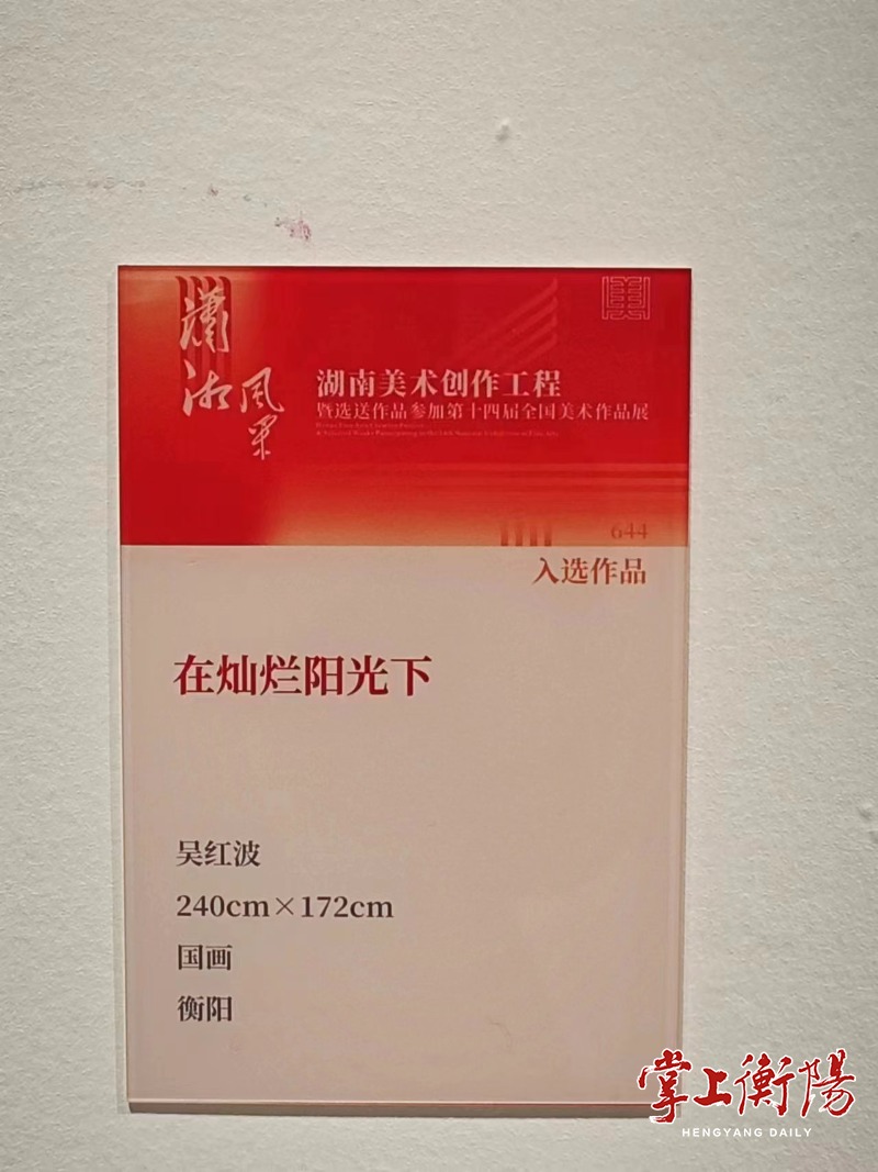 据悉,由文旅部、中国文联、中国美协联合举办的第十四届全国美展五年开展一次,是我国规模最大、学术最高、画种最齐的美术大展。问及作者的创作心得时,吴红波说,《在灿烂阳光下》是她从2023年就开始构思的一幅作品,历时半年创作。画面通过向阳绽放的花朵来展示三湘儿女为实现“三高四新”美好蓝图努力拼搏的精气神。今年4月,该作品一路过关斩将,从1548件作品中脱颖而出,入选“潇湘风采·湖南美术创作工程展”。
