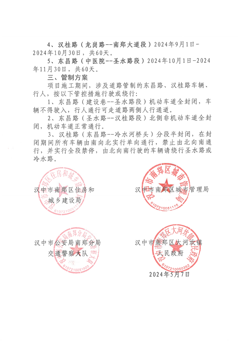 关于南郑区大河坎东昌路、汉桂路交通管制的通告