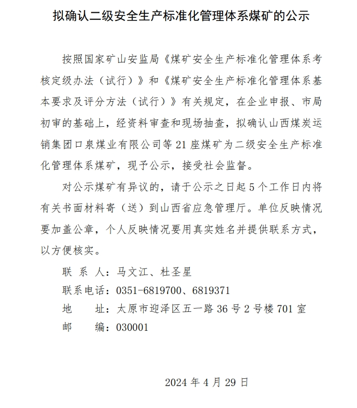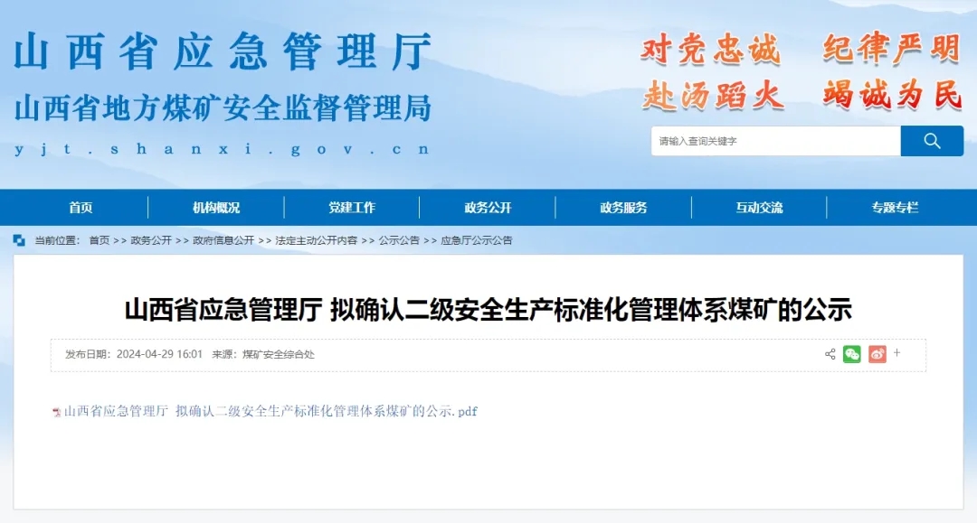 我市2座煤矿被拟确认为二级安全生产标准化管理体系煤矿