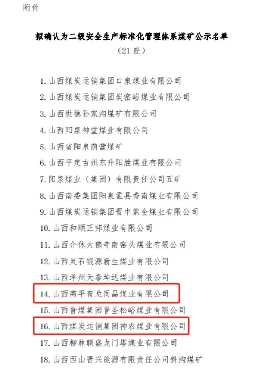 近日,山西省应急管理厅发布《拟确认二级安全生产标准化管理体系煤矿的公示》,其中,我市2座煤矿被拟确认为二级安全生产标准化管理体系煤矿,分别是山西高平青龙同昌煤业有限公司、山西煤炭运销集团神农煤业有限公司。