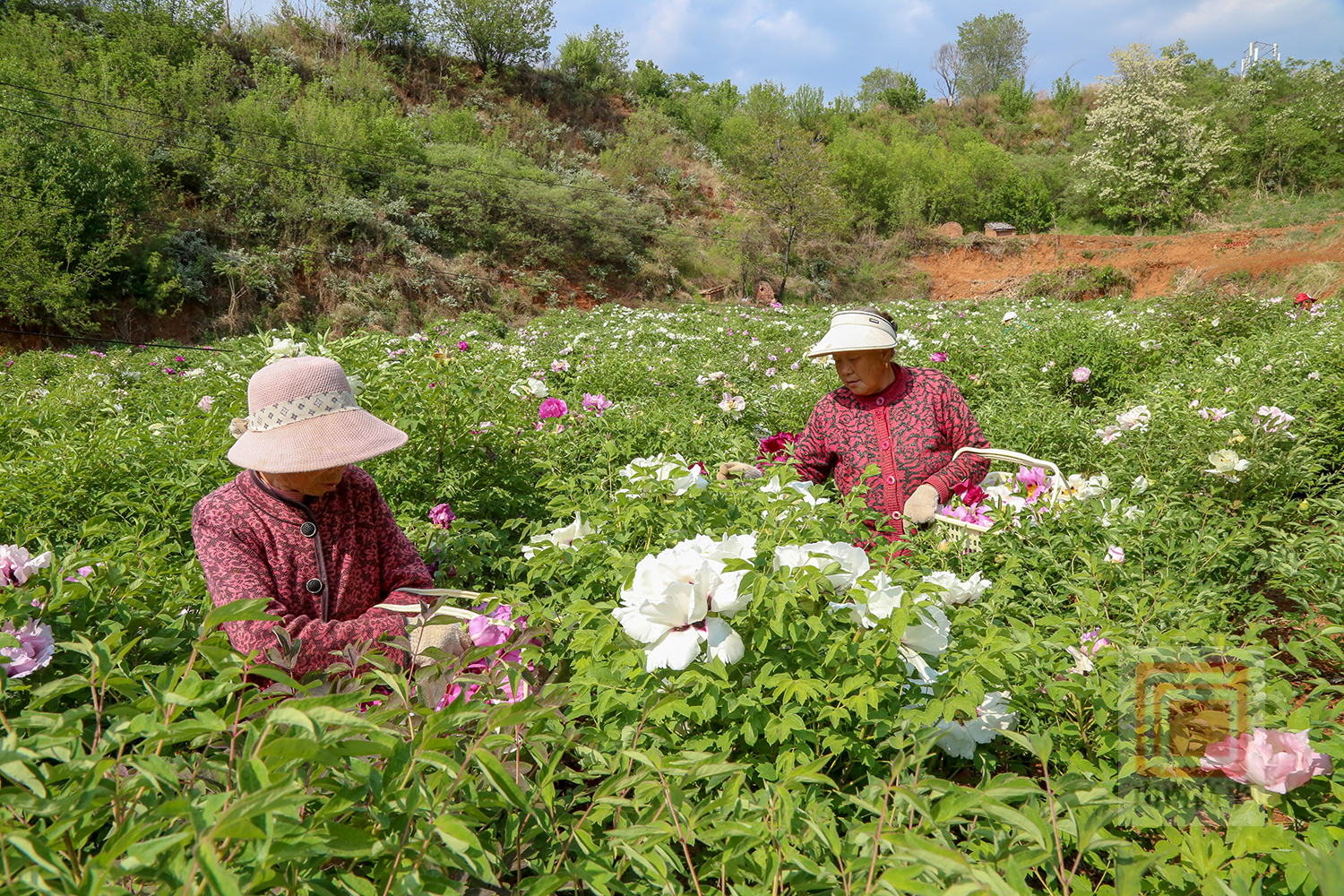 来到千亩紫斑牡丹种植基地,漫山遍野的牡丹花铺展开来,姹紫嫣红、蔚为壮观。花丛中,十多名村民动作娴熟地采摘牡丹花,好一幅色彩斑斓的春日画卷。