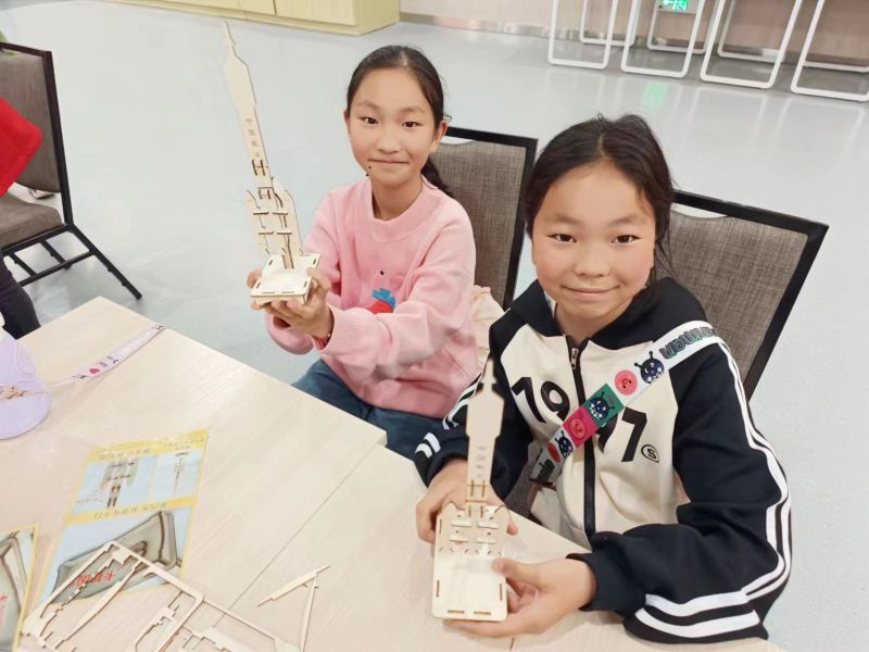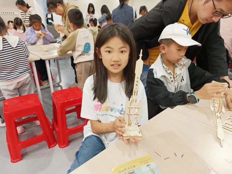 在老师的指导下,青少年们自己动手制作火箭模型,兴高采烈地展示自己创作的作品。