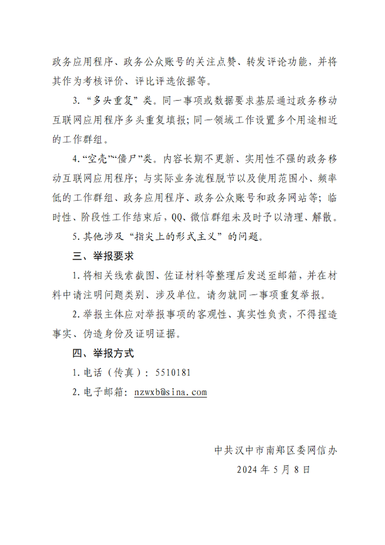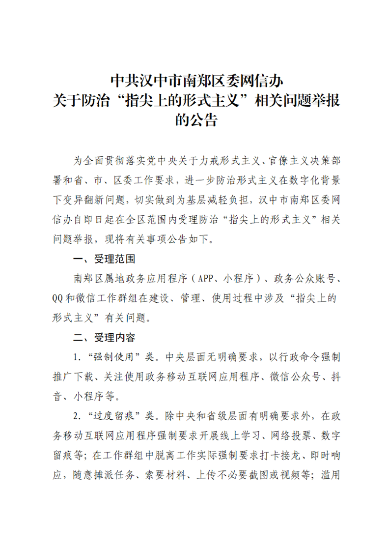 中共汉中市南郑区委网信办关于防治“指尖上的形式主义”相关问题举报的公告