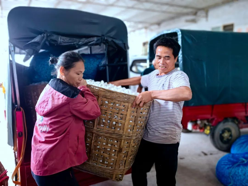 5月6日,虽然下着蒙蒙细雨,但是鹿寨古典桑蚕丝织有限公司黄冕鲜茧收购站内却是一派繁忙景象。一大早,蚕农们便驾着农用拖拉机、三轮车纷至沓来,排起长队,等待售卖蚕茧。收购员们则不停忙着验货、定价、称茧、开票、结算、入库等,一系列流程后,蚕农们获取了今年种桑养蚕的“第一桶金”。