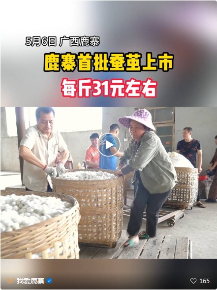 鹿寨古典桑蚕丝织有限公司主任梁标说:“我们公司从5月4日开始收蚕茧,总体来说对这批蚕茧的质量还是比较满意的,现在每市斤大约在31元/斤,到6号为止收了将近6万斤蚕茧。”