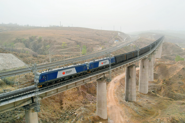 图为满载煤炭的列车行驶在大准线田家石畔大桥上