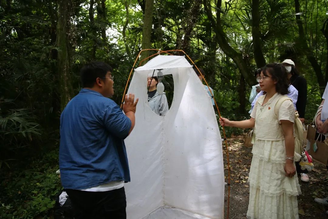 穿过郁郁葱葱的树林,踏上蜿蜒曲折的小径,学生们不时停下脚步,仔细观察着周围的动植物,记录着所见所闻。专业的生物多样性调查是怎样开展的?工作人员拿出捕虫网、帐篷等工具,分别演示了在白天、夜间如何捕捉记录昆虫、哺乳动物等生物。
