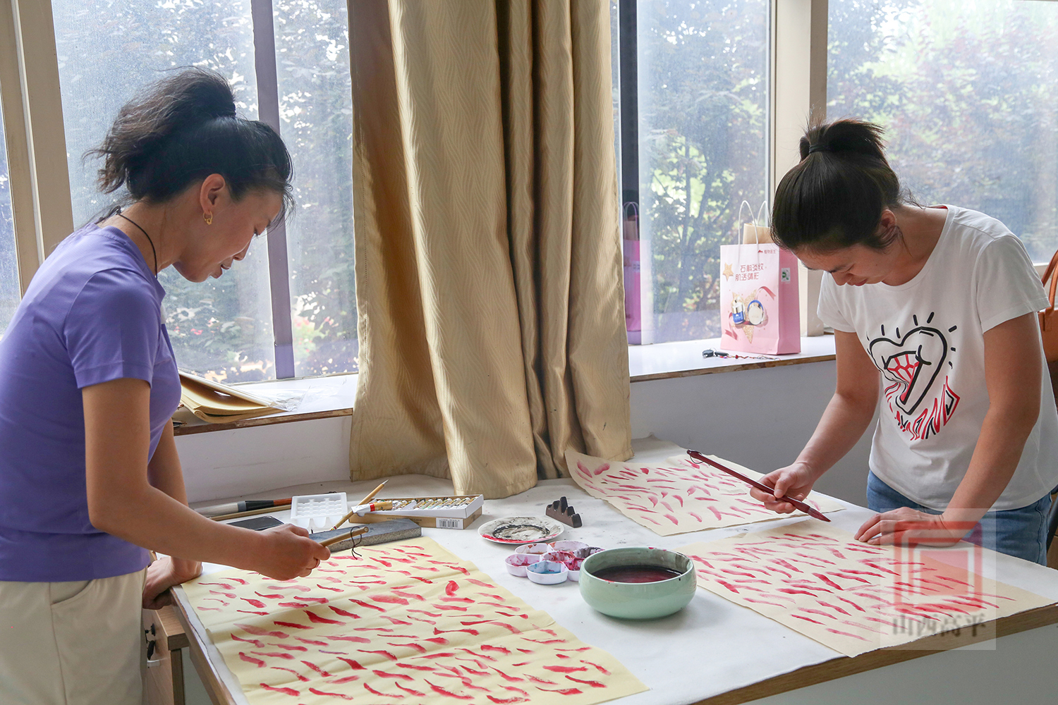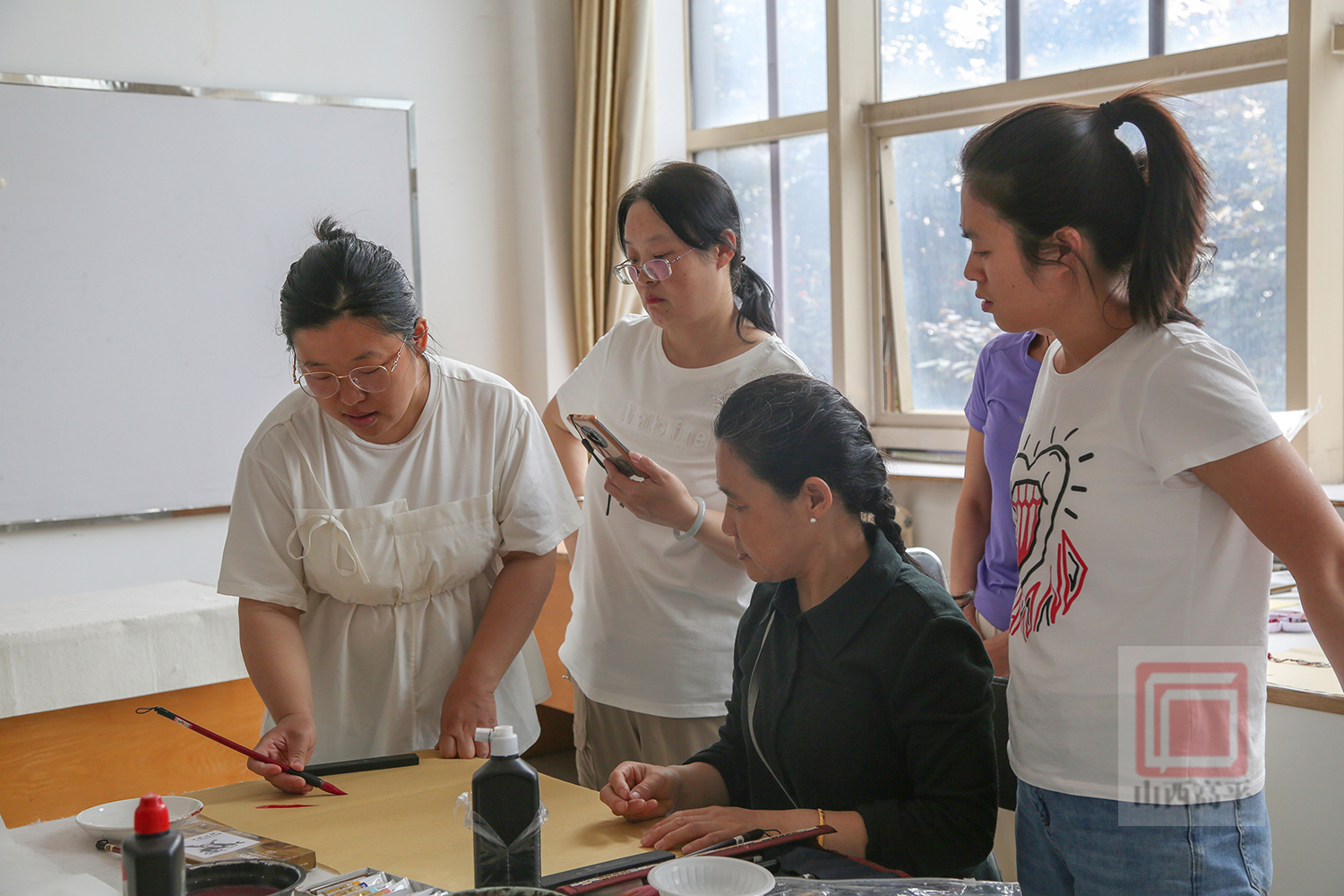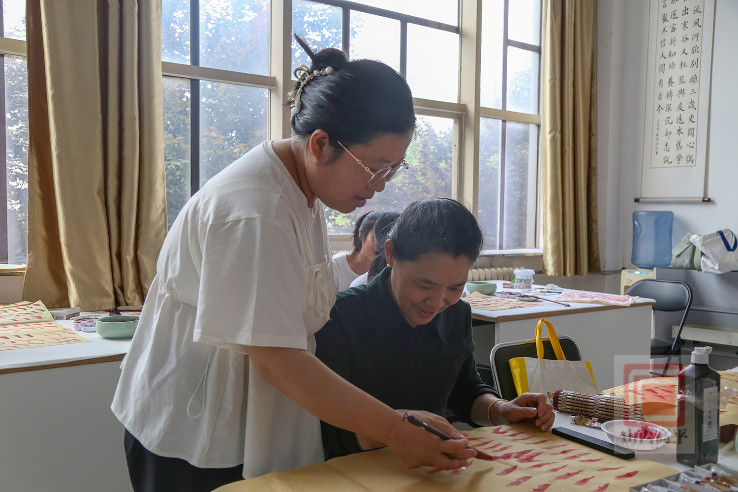 教师赵静告诉我们:“这里大部分学员都是第一次学国画,为了激发大家的创作灵感,我从如何调颜料,如何用笔,怎样运用点线面来开展水墨画等基础知识开始讲起,一步步引导大家发现美、表现美、创造美,从而感受水墨画中流淌的独特魅力,让大家逐渐爱上国画。”