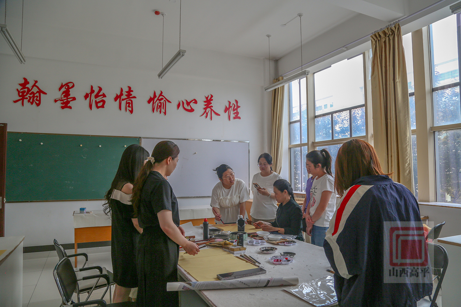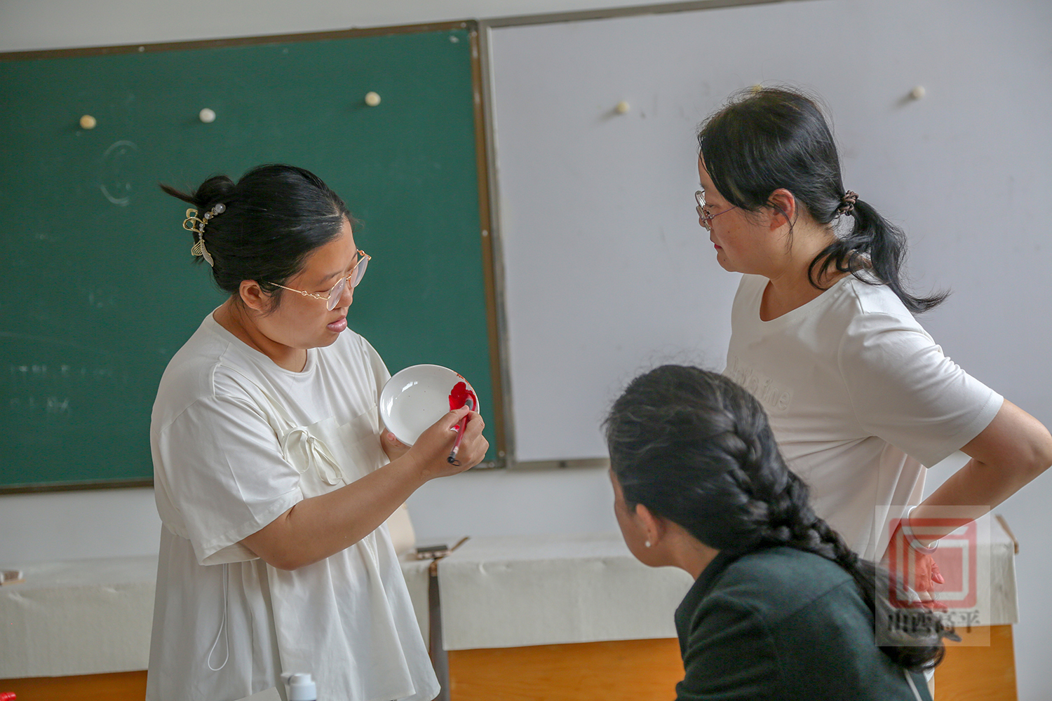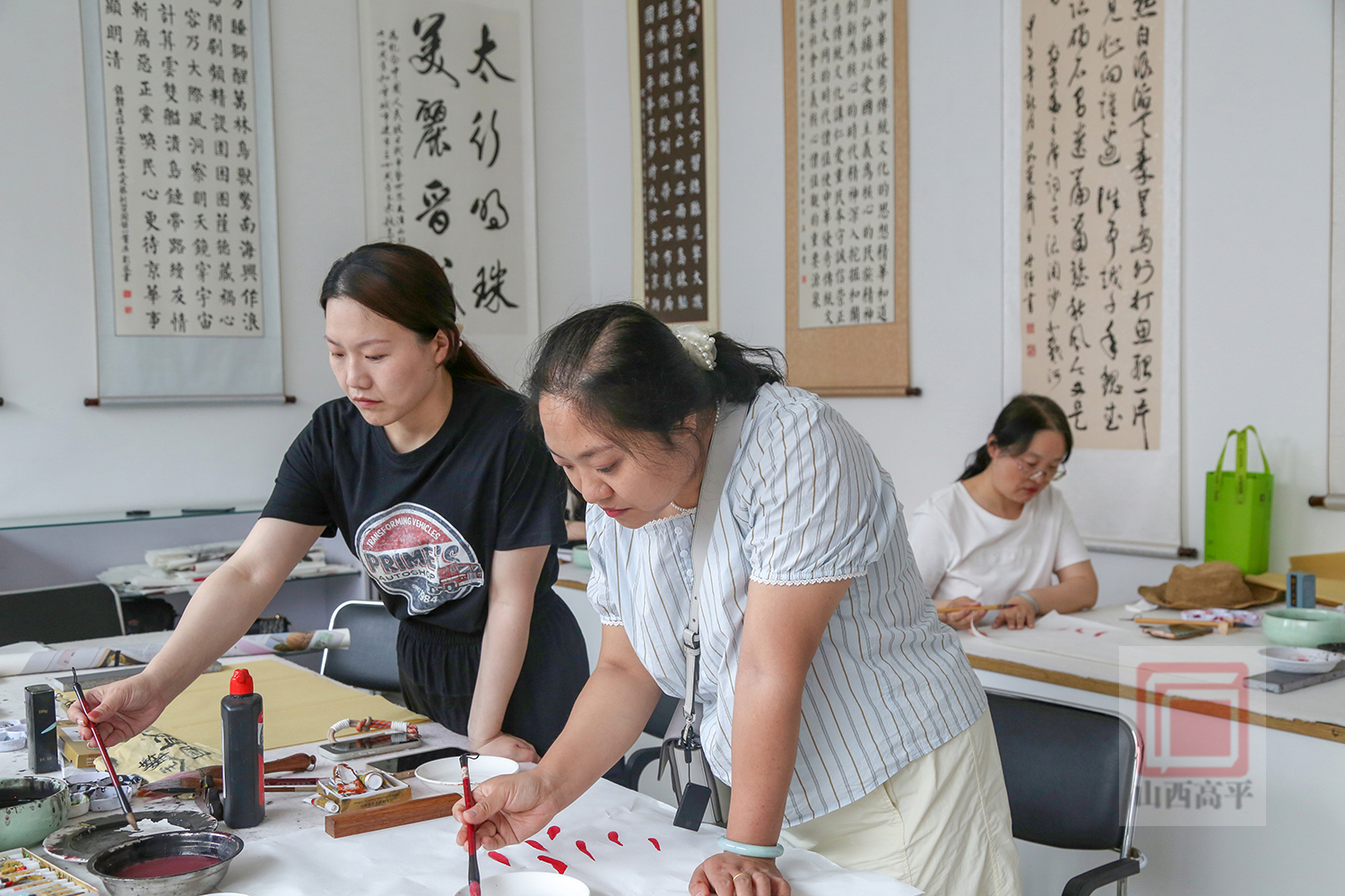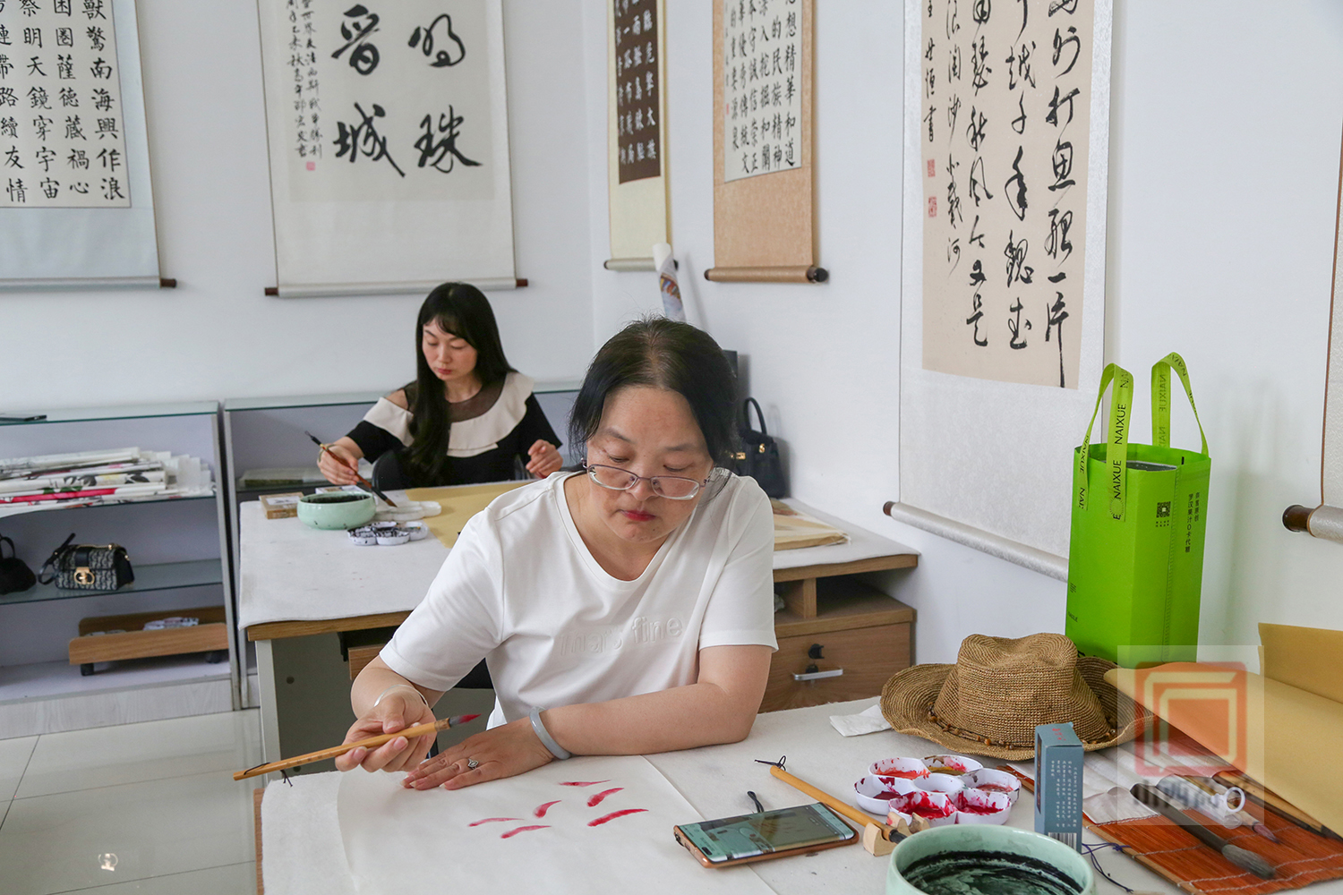 教师赵静告诉我们:“这里大部分学员都是第一次学国画,为了激发大家的创作灵感,我从如何调颜料,如何用笔,怎样运用点线面来开展水墨画等基础知识开始讲起,一步步引导大家发现美、表现美、创造美,从而感受水墨画中流淌的独特魅力,让大家逐渐爱上国画。”