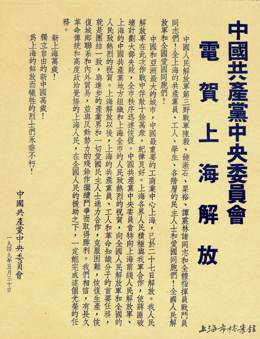 1949年5月30日,中共中央发来贺电。贺电最后以饱含感情的3句口号作结:“新上海万岁!独立自由的新中国万岁!为上海的解放而牺牲的烈士们永垂不朽!”