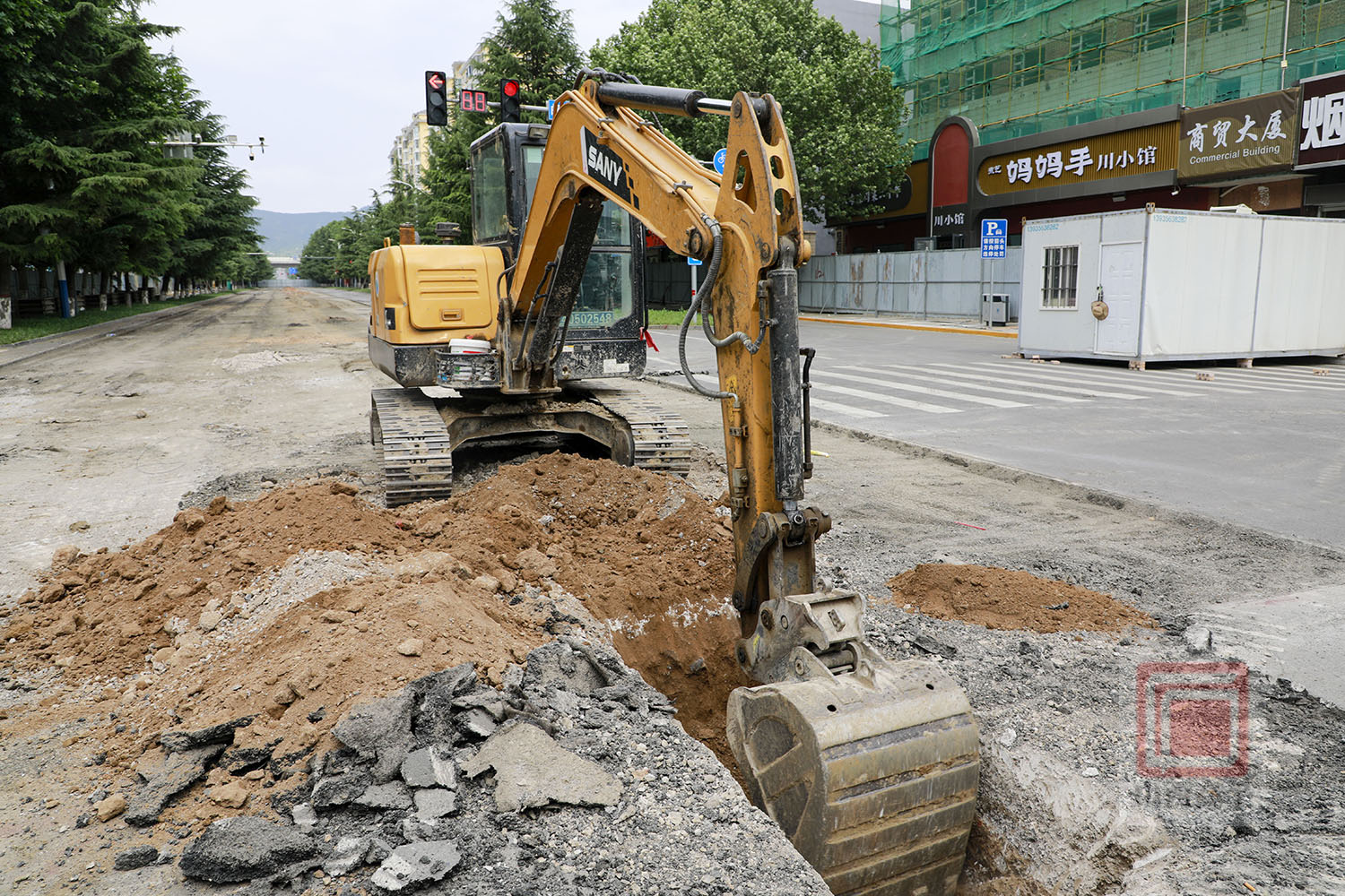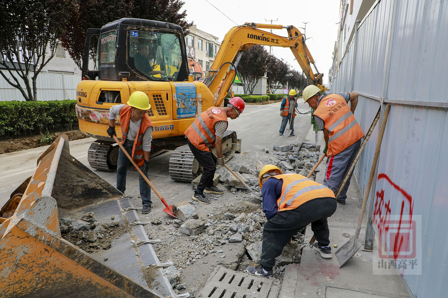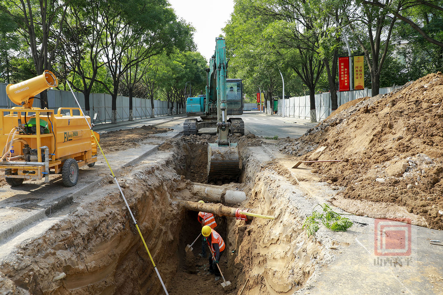 来到康乐东街段雨污分流改造现场,大型机械设备隆隆作响,工人师傅们分工协作,干劲满满,加快进行预制方沟盖板和开挖沟槽等作业。为确保环保施工,现场还配备了洒水车来回进行洒水降尘作业。