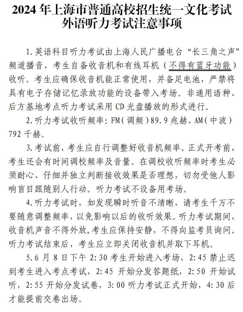 2024年上海市普通高校招生统一文化考试将于6月7日至9日举行!考前提醒请查收!