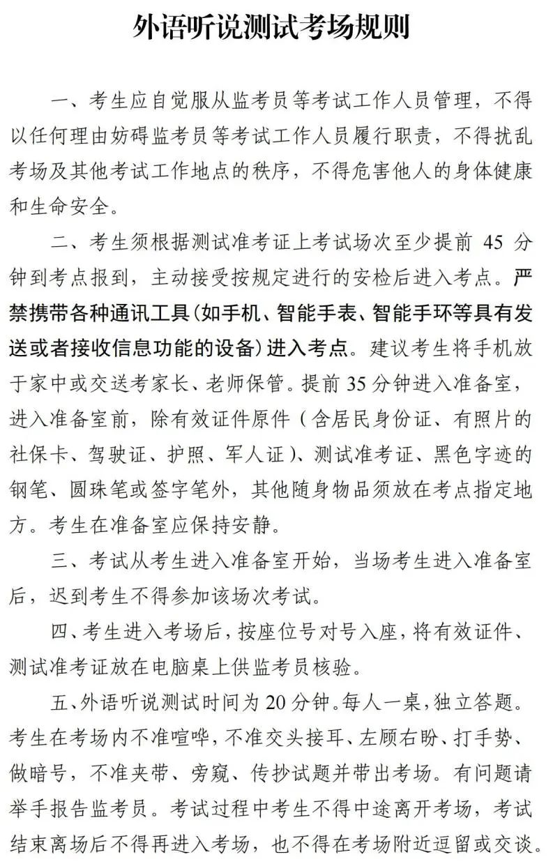 1.带齐两证赴考。考生参加语文、数学、外语笔试(含听力)考试,必须凭纸质版《准考证》与本人有效证件原件进入考场;考生参加外语听说测试,必须凭纸质版《外语听说测试准考证》与本人有效证件原件进入考场。请仔细阅读准考证上的说明和要求,妥善保管好准考证,不得在准考证上做任何内容书写。