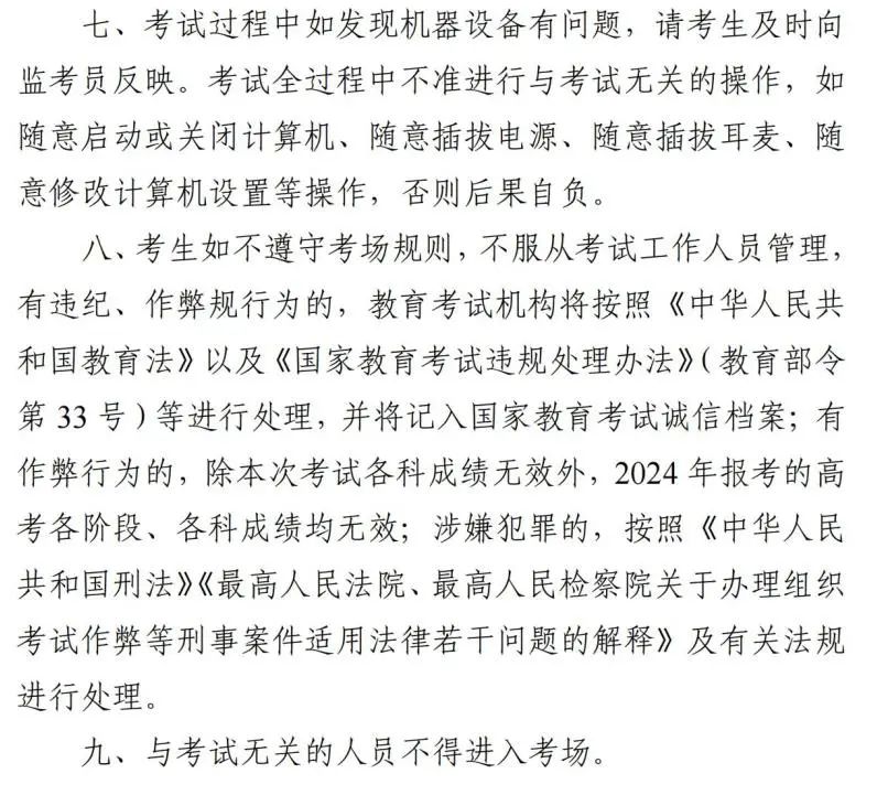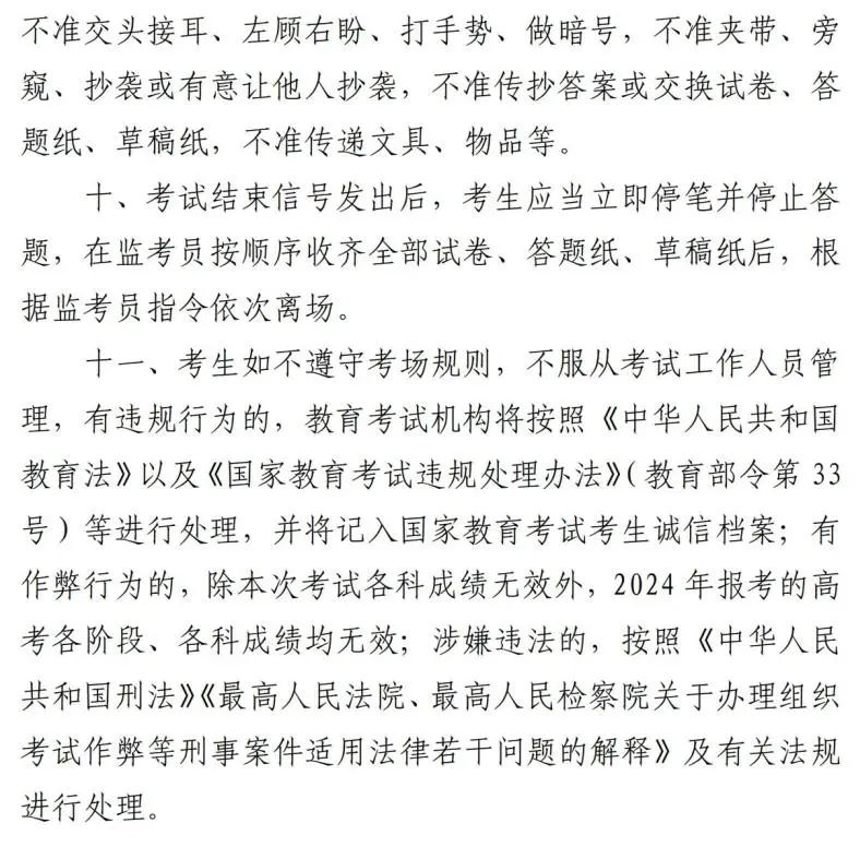 3.诚信参加考试。考试期间,教育、公安、网信、无线电管理等部门将对考场内及周边环境进行整治,对涉嫌利用通讯工具作弊人员进行严肃查处,涉嫌犯罪的追究刑事责任。考生须认真阅读并自觉遵守《考场规则》(详见文末),诚信考试。警惕网上虚假信息,保护自身利益。如有违规、违法行为将按《中华人民共和国教育法》《国家教育考试违规处理办法》《中华人民共和国刑法》《最高人民法院 最高人民检察院关于办理组织考试作弊等刑事案件适用法律若干问题的解释》严肃处理。