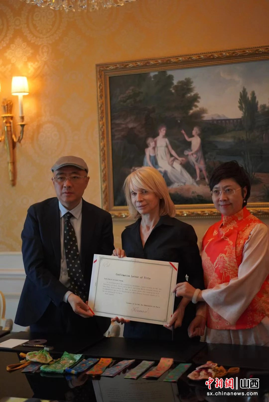 图为:太湖世界文化论坛副主席兼秘书长郑传焮(左)、巴黎名媛舞会创始人奥菲莉·雷努阿(中)、中国国家级非物质遗产保护织造技艺(潞绸)传承人王淑琴在签约仪式现场。