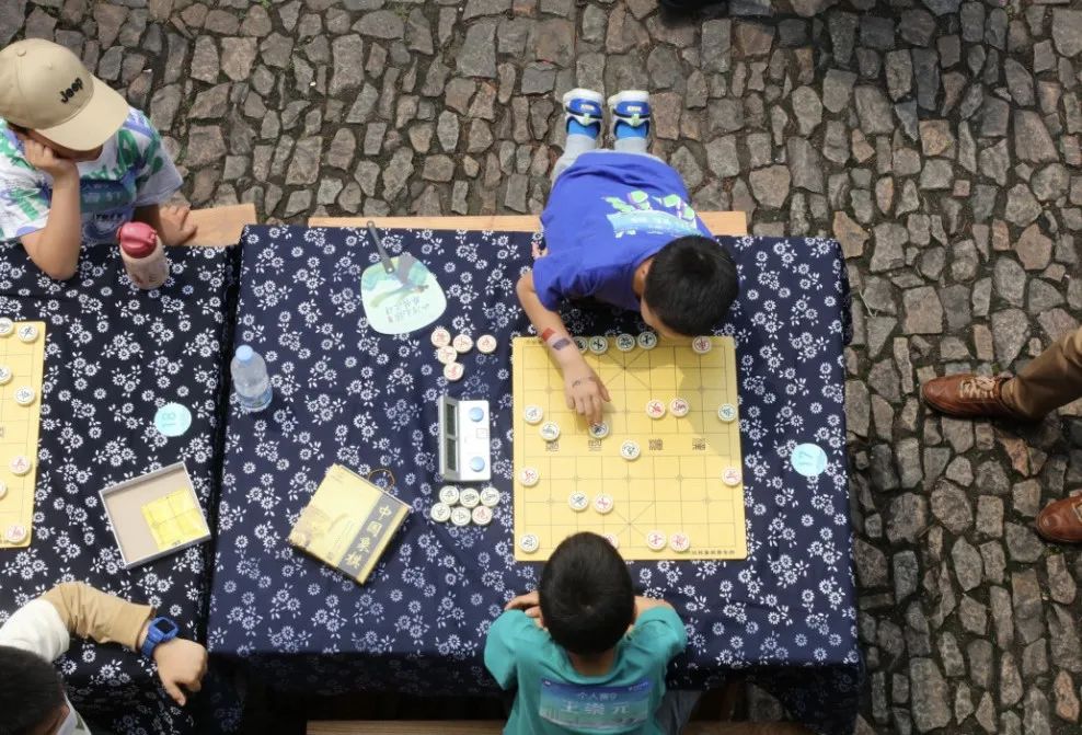现场,南翔老街中央摆起了一长溜的比赛用桌,完成分组赛的小朋友和家长准备就绪。上午10点,裁判一声令下,对弈开始。选手们或沉思冥想,或果断出击,力求在棋盘上占据优势。一旁的观众也是全神贯注地紧盯棋盘,还不时就选手的表现点评一二,现场气氛热烈。