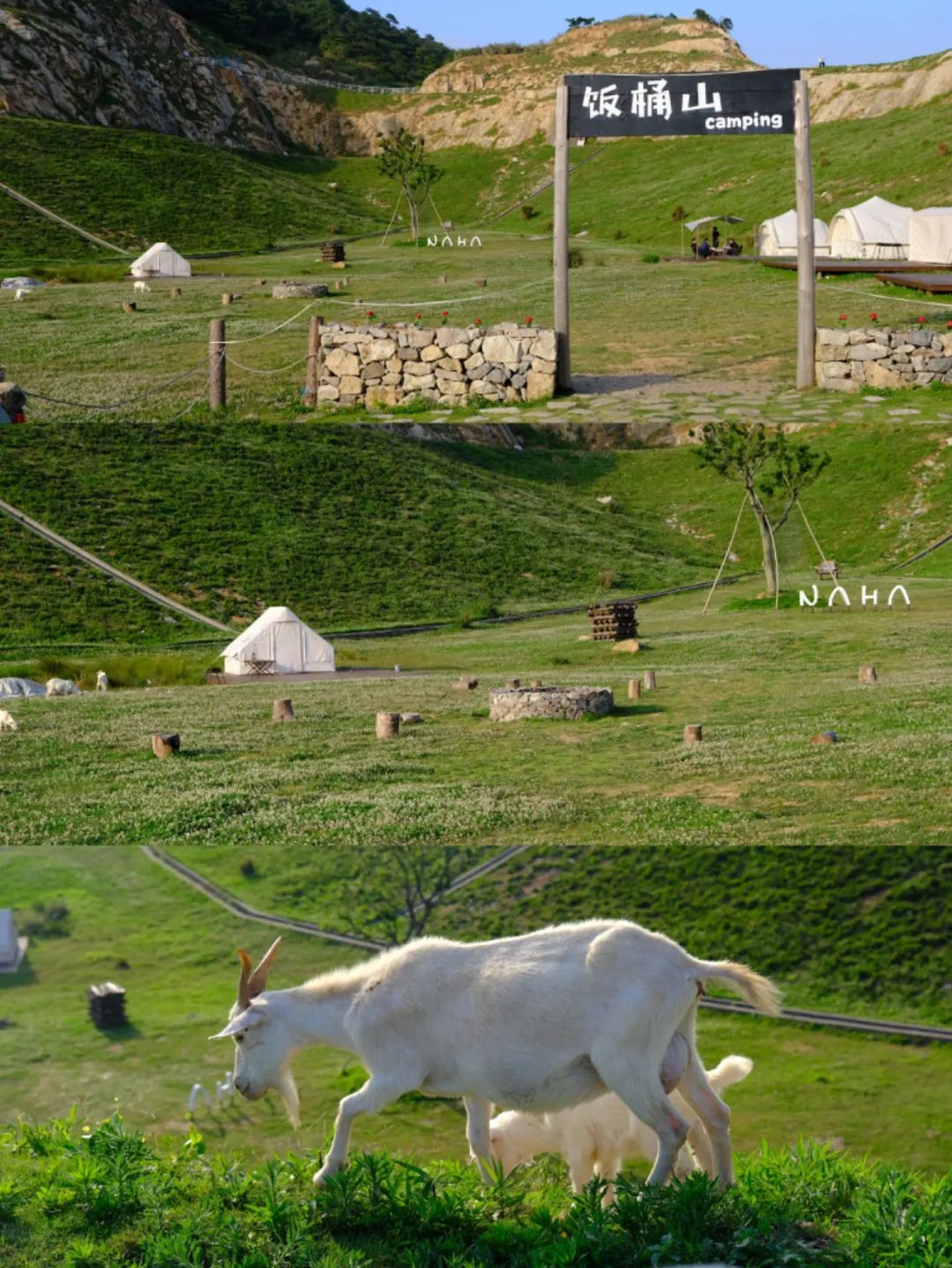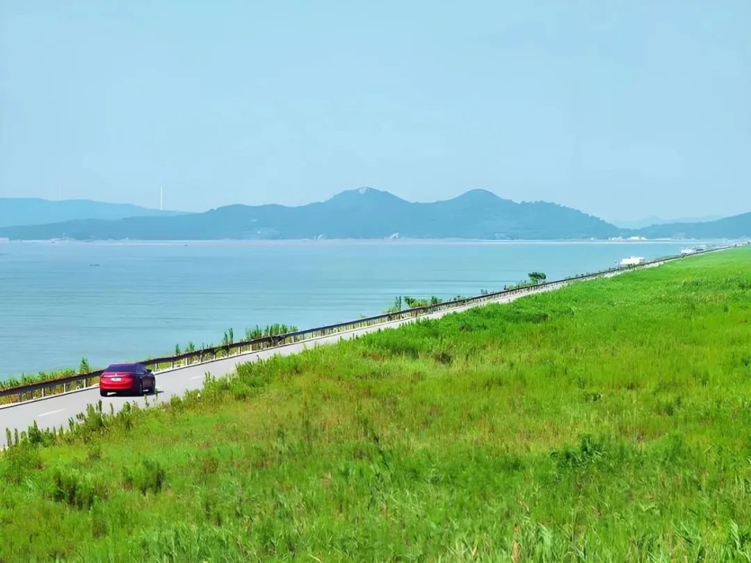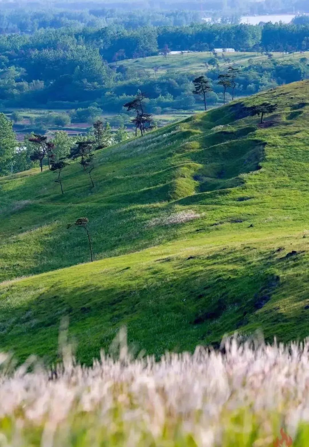 去逛饭桶山能同时拥有苍茫草原和广袤大海两种感官刺激,一边是连绵的绿荫草地,一边是粼粼波光的海面,青碧地泛蓝,深远而浩渺,与天接壤在视线极尽处。