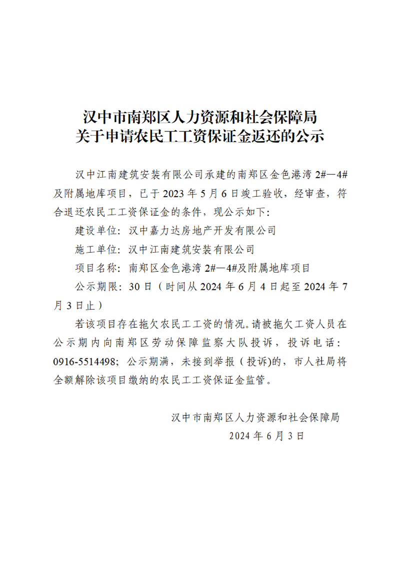 汉中市南郑区人力资源和社会保障局关于申请农民工工资保证金返还的公示