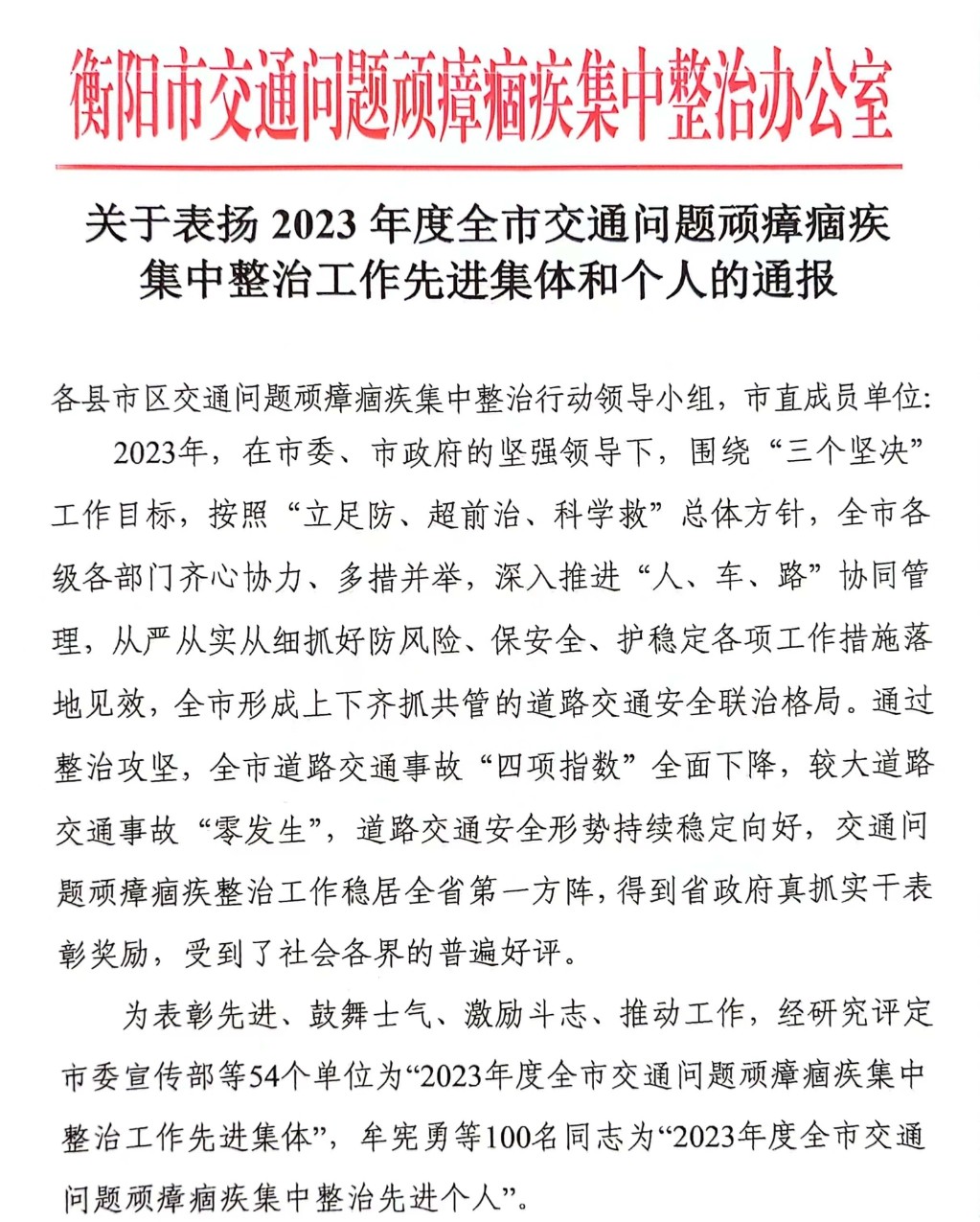 近日,全市交通问题顽瘴痼疾集中整治行动总结表彰暨2024年系统整治工作推进视频会召开,会议印发了《关于表扬2023年度全市交通问题顽瘴痼疾集中整治工作先进集体和个人的通报》,衡阳市公路建设养护中心获评全市交通问题顽瘴痼疾集中整治工作先进集体。