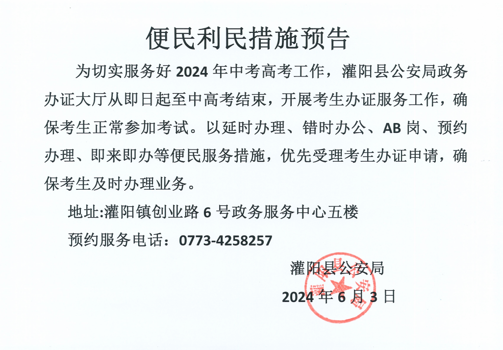 2024年中高考即将来临,为切实服务好2024年中高考工作,解决广大考生因未及时办理居民身份证或证件损坏、丢失等问题影响正常参加考试的情况发生。灌阳县公安局从即日起至高考、中考结束,为全县中高考学生开辟办理居民身份证、临时身份证“绿色通道”,为广大考生快速办理身份证件,确保考生正常参加考试。 中高考前,全县各派出所及户政办证大厅将全部开展预约办证服务、延时服务,为考生提供服务。对办理临时身份证的考生,将做到当场受理、当场办证、当场领取。