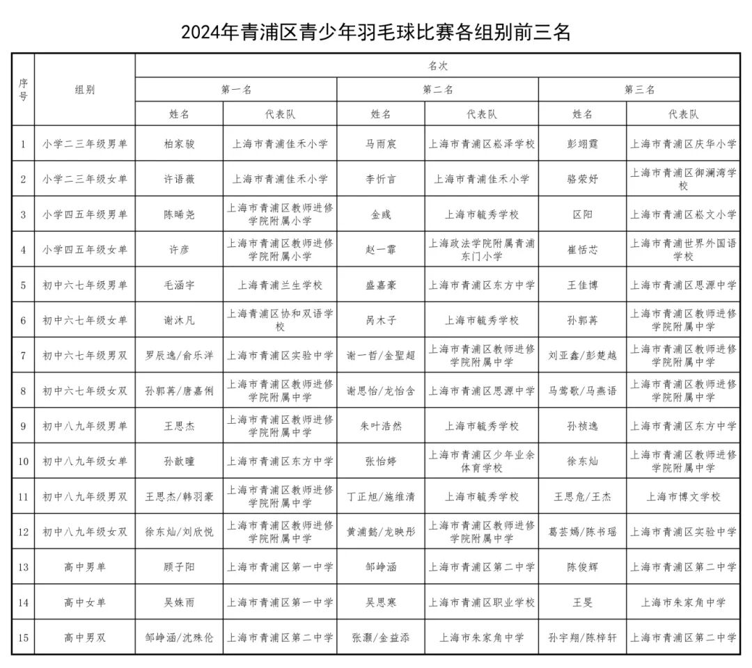 本次青浦区青少年羽毛球比赛的成功举办,不仅为全区青少年羽毛球爱好者提供了一个展示自我、交流学习的平台,更在推广羽毛球运动、推进青少年运动员梯队建设发挥了积极作用。