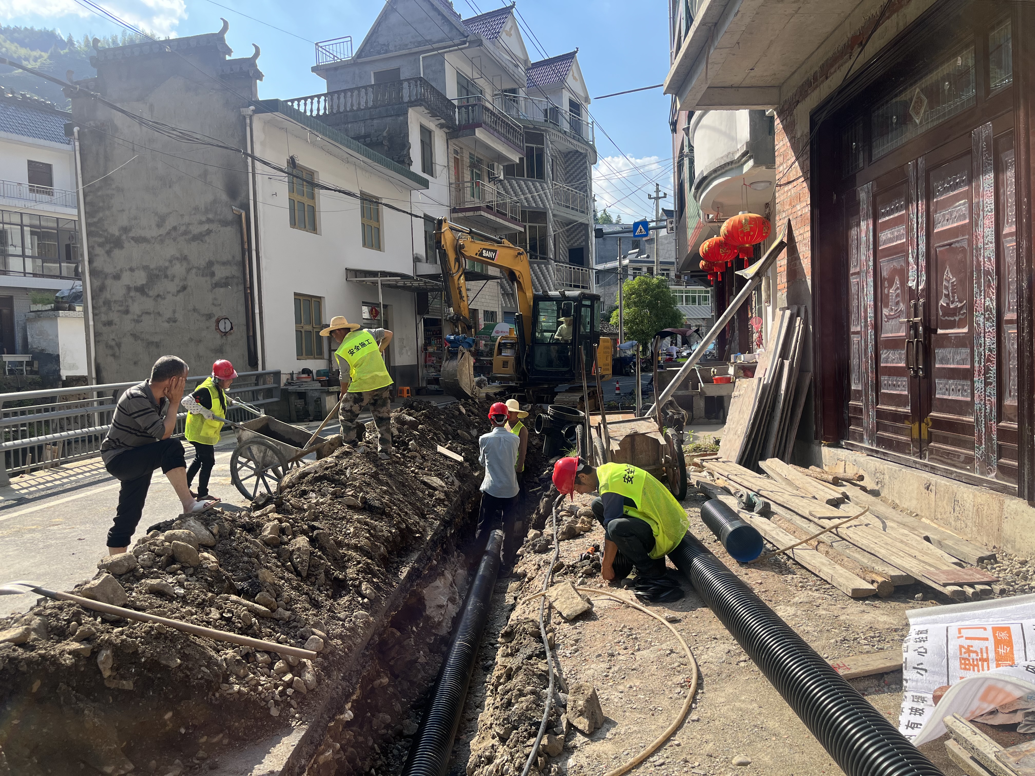 在徐家村上下徐生活污水治理施工现场,工人们正在忙碌着铺设污水管网。该项目为2024年新安江-千岛湖流域生态补偿试点项目,预计2024年7月投入使用,在进一步改善水环境质量的同时,将解决100余户群众污水排放问题,全乡污水治理率也将达60%以上。
