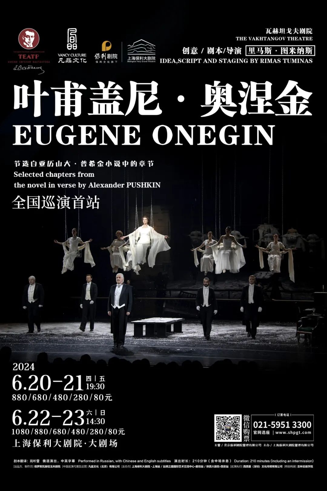 作为今年的重磅策划之一,由俄罗斯瓦赫坦戈夫剧院制作出品的原版话剧《叶甫盖尼·奥涅金》将于6月20日—23日在上海保利大剧院连演4场。该剧曾获得俄罗斯国家戏剧最高奖“金面具奖”,由传奇戏剧大师里马斯·图米纳斯担任创意、剧本和导演。今年恰逢中俄建交75周年暨“中俄文化年”,上海站作为中国巡演的首站以及华东地区的唯一站,观众将有机会领略世界顶级戏剧的强大魅力,享受极致的俄式美学冲击。