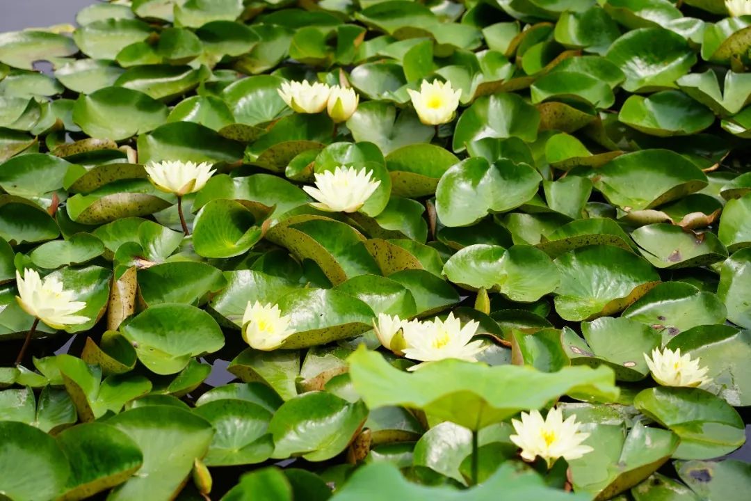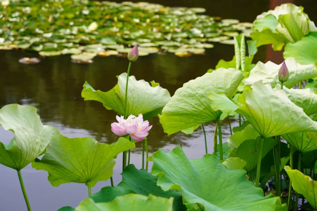 此时在嘉北郊野公园的荷花池内,田田荷叶错落有致地铺散开来,满目清新绿意映入眼帘,部分荷花也已竞相盛放。粉红、粉白、淡黄……当微风轻拂湖面,吹皱一池繁花时,轻颤摇曳的荷花与荷叶互相映衬、相辅相成,美得不可方物。