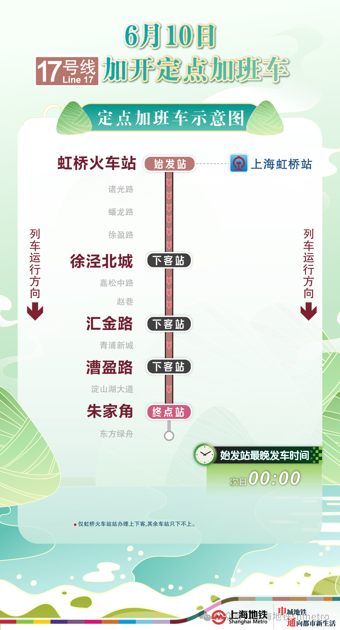 17号线虹桥火车站站往朱家角站方向加班车,沿途停靠虹桥火车站站、徐泾北城站、汇金路站、漕盈路站、朱家角站(终到站),其余车站跳停。停靠车站中,虹桥火车站站(始发站)办理上客,其余车站只下不上。