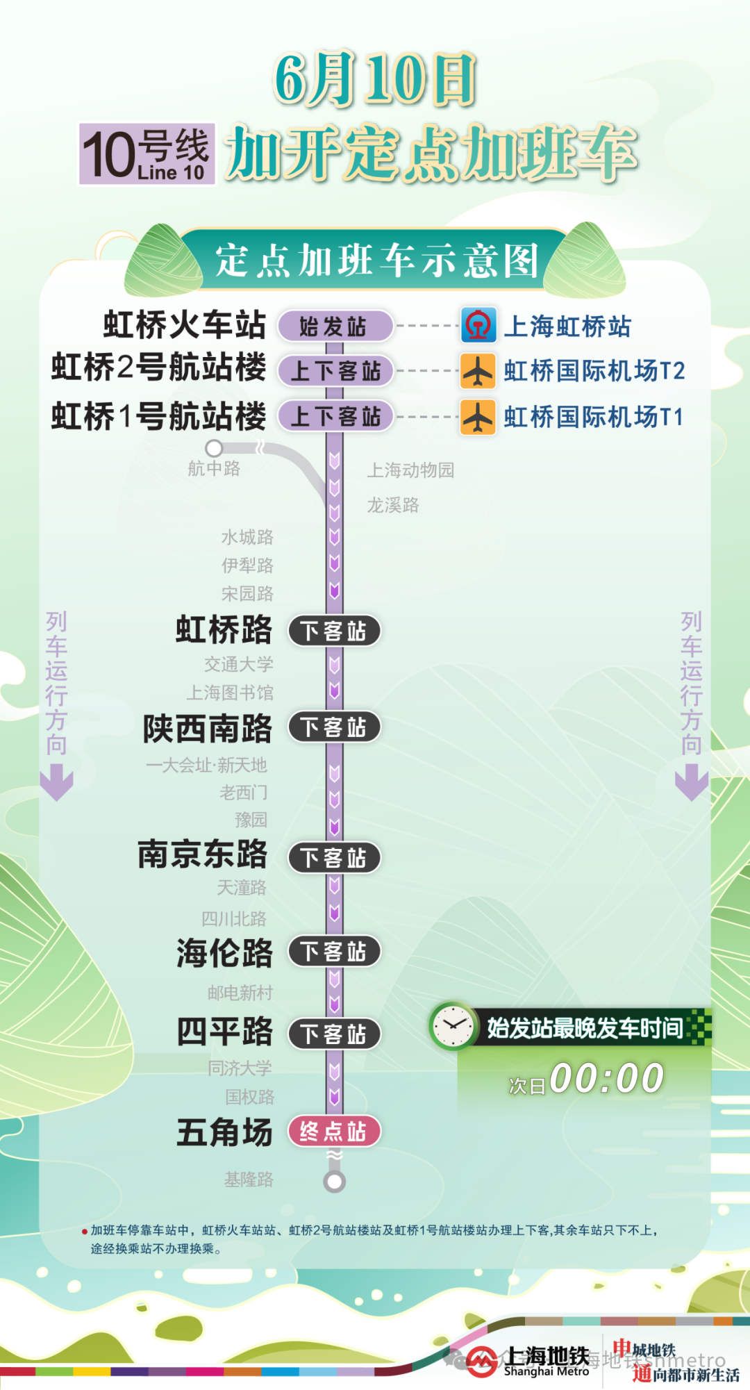 10号线虹桥火车站站往五角场站方向加班车,沿途仅停靠虹桥火车站站、虹桥2号航站楼站、虹桥1号航站楼站、虹桥路站、陕西南路站、南京东路站、海伦路站、四平路站、五角场站(终到站),其余车站跳停。停靠车站中,虹桥火车站站(始发站),虹桥2号航站楼站、虹桥1号航站楼站办理上下客,其余车站只下不上,途经换乘站不办理换乘。